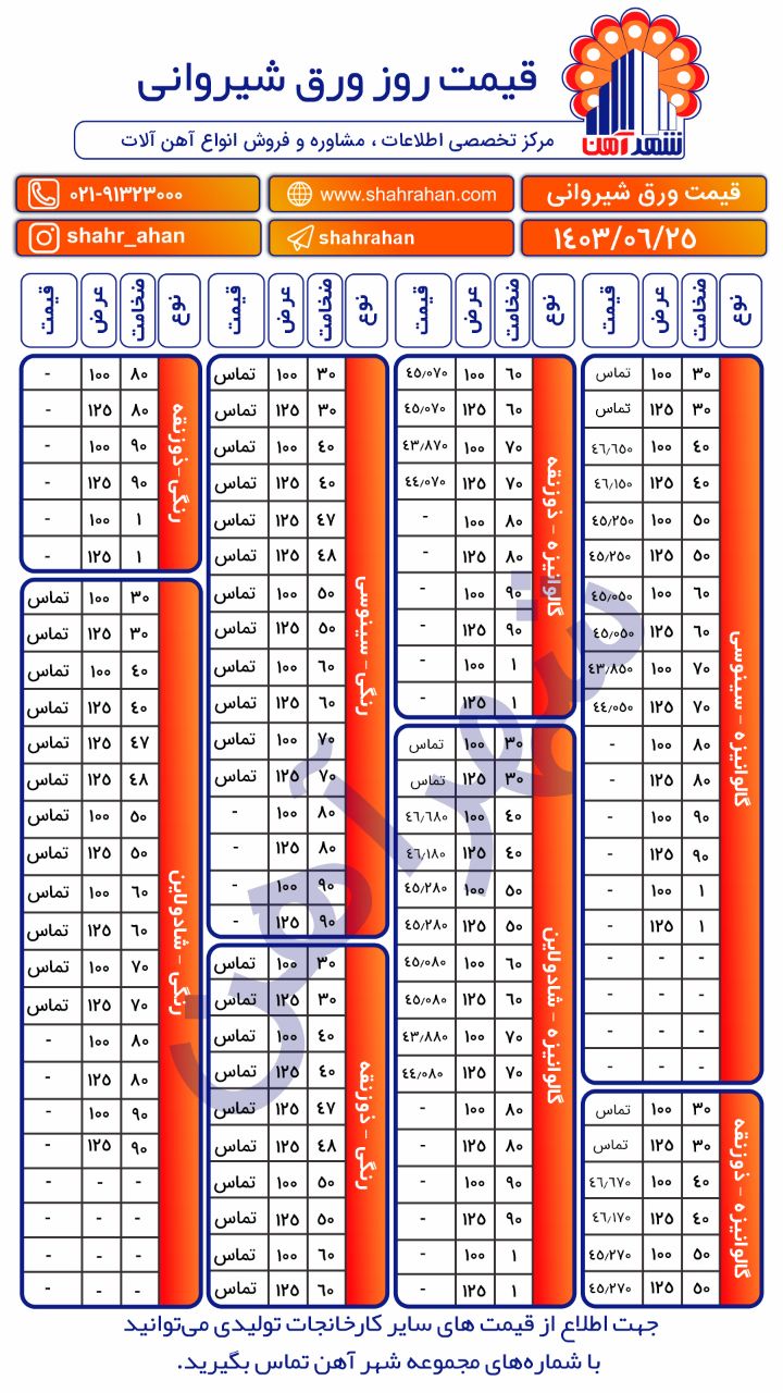قیمت ورق شیروانی 🗓 25 #شهریور 1403 #ورق #شیروانی #ورق_شیروانی 📞شماره تماس با مجموعه 👇 02191323000 🔸مشاهده قیمت به روز کلیه کارخانجات 👇 www.shahrahan.com 📣کانال تلگرام 👇 https://t.me/shahrahan 🌍آدرس مجموعه شهرآهن 👇 https://goo.gl/maps/JQsgAUrmvw8Bomy26