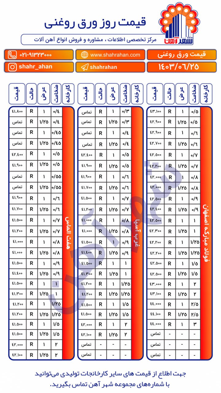 قیمت ورق روغنی 🗓 25 #شهریور 1403 #ورق #روغنی #ورق_روغنی 📞شماره تماس با مجموعه 👇 02191323000 🔸مشاهده قیمت به روز کلیه کارخانجات 👇 www.shahrahan.com 📣کانال تلگرام 👇 https://t.me/shahrahan 🌍آدرس مجموعه شهرآهن https://goo.gl/maps/JQsgAUrmvw8Bomy26