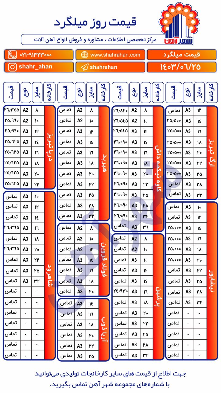 قیمت میلگرد 🗓 25 #شهریور 1403 #میلگرد 📞شماره تماس با مجموعه 👇 02191323000 📣کانال تلگرام 👇 https://t.me/shahrahan 🔸مشاهده قیمت به روز کلیه کارخانجات 👇 www.shahrahan.com 🌍آدرس مجموعه شهرآهن https://goo.gl/maps/JQsgAUrmvw8Bomy26