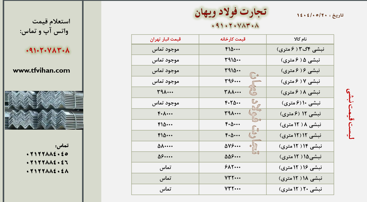 💭 دوشنبه 20 مردادماه 1404 #پروفیل_زد_فولادی #زد_فولادی/اهوازی ⬅️انبار اصفهان وتهران➡️ ✅زد ارتفاع ۱۸ ضخامت ۲( فولاد) ⬅️ 42800 ✅زد ارتفاع ۱۸ ضخامت ۲(متفرقه) ⬅️ 📞 ✅زد ارتفاع ۱۸ ضخامت ۲/۵و3(فولاد) ⬅️ 41300 ✅زد ارتفاع ۲۰ ضخامت۲/۵و۳. ⬅️ 41800 ✅زدارتفاع ۲۲ ضخامت.۲/۵و۳ ⬅️ 📞 ✅زد ارتفاع ۲۴ ضخامت ۳ و۴ ⬅️ 📞 ✅زد ارتفاع ۲۶ ضخامت ۳ و۴ ⬅️ 📞 ✅زدارتفاع ۲۸ ضخامت ۳ و۴. ⬅️ 📞 ✅زد ارتفاع ۳۰ ضخامت ۳ و۴. ⬅️ 📞 ✅زدارتفاع ۳۲ ضخامت ۳ و۴. ⬅️ 📞 🔈 03191008020 داخلی 104 الی 105 🌐 www.modernfoolad.com 🌐 https://t.me/modernfoolad 🌐 https://chat.whatsapp.com/IVtzMuLZXTJ9Bl7sxlqmnd