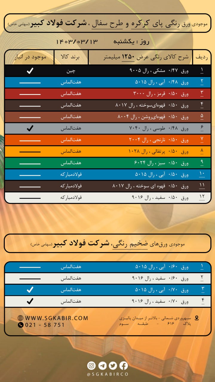 #فولاد_کبیر 🫥لیست موجودی ورقهای رنگی 🫥 موجودی رنگها⤵️ ✅ مشکی ، چین ، 0/47 ، 1250 ✅ طوسی ، هفتالماس ، 0/48 ، 1250 ضخیم بار⤵️ ✅ آبی ، هفتالماس ، 0/70 ، 1250 ✅ سفید ، هفتالماس ، 0/70 ، 1250 🕐لینک قیمت بهروز ورقهارنگی (https://sgkabir.com/products/coloredsheet/%D9%88%D8%B1%D9%82-%D8%B1%D9%86%DA%AF%DB%8C) ✅ شرکت فولادکبیر (سهامیخاص) #جهت_مشاهده_پروفایل_فولاد_کبیر👇🏻 🔸https://foolad24.com/profile/9205 #جهت_مشاهده_اعلام_موجودی_فولاد_کبیر👇🏻 https://foolad24.com/profile/9205/inventory ☎️تلفن تماس: 021-58751 🔗لینک سایت: www.sgkabir.com 🔗لینک کانال تلگرام: https://t.me/sgkabirco 🟥🔗لينك گروه فولادوساختمان: https://t.me/kabirco1 ٫ ☎️021-58751 🌐 www.Sgkabir.com 🆔 https://www.instagram.com/sgkabirco/?hl=en