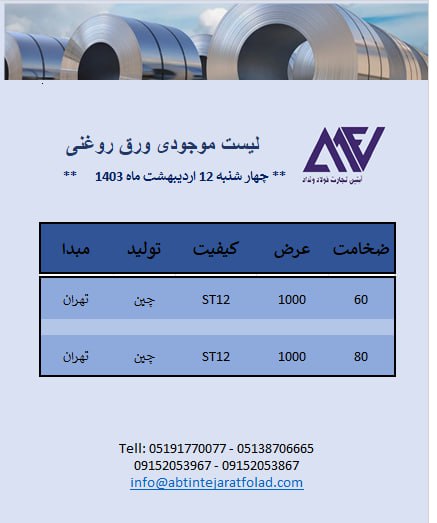 ورقهای روغنی انبار تهران ورق ۶۰روغنی ۱.۸.۵×۱.۲۵ مبارکه ورق ۶۰عرض۱.۲۵ EK4 مبارکه ورق ۷۰عرض۱متر EK4مبارکه ورق ۱عرض۱ ST12 مبارکه ورق۱.۵ عرض۱.۲۵ ST12 مبارکه. تماس. ۰۲۱۲۲۷۴۸۴۲۲