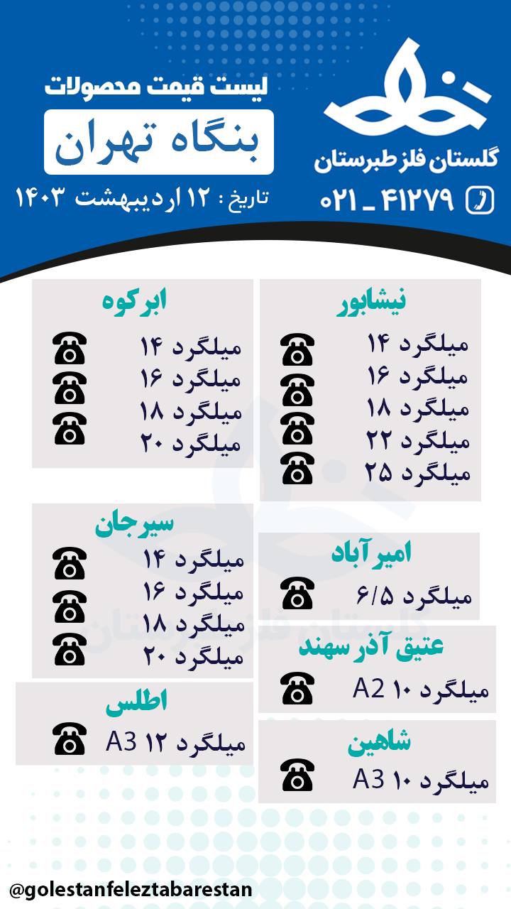 اهن الات رحيمي دوستان: (اهن مکان) 10خرمدشت: 10آسیا: 12گلستان: 14ابرکوه: 14خلیج: 18ابرکوه: 20ابرکوه: 20میلادیزد: 20نیشابور: 22نیشابور: درصورت نیاز فاکتور رسمی صادر میگردد http://Aloahaan.ir(جهت وارد شدن به سایت فیلترشکن خاموش فرمایید) 55446067-69 55446081-82 https://t.me/frdrahimy 09127777967 09127777387 09125602500