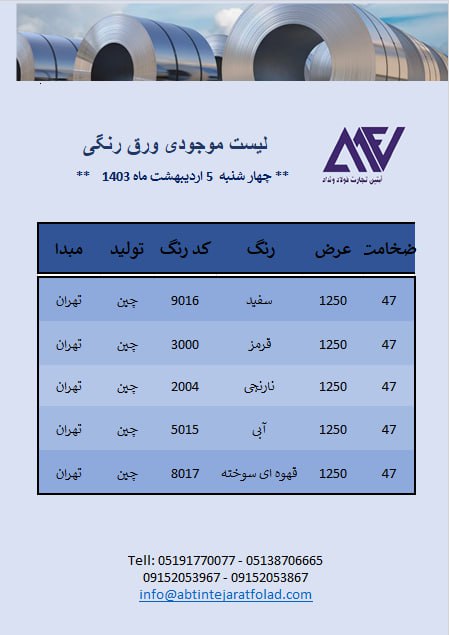 #ابنیه_فولاد_آریو تامین کننده انواع ورق گالوانیزه و رنگی (در طرحهای عرشه فولادی، شادولاین، کرکره و ...) عاملیت فروش گلمیخ فولاد آلیاژی 🏗مجری تخصصی سقف عرشه فولادی ️خریدی امن را با ما تجربه کنید. #جهت_مشاهده_پروفایل_ابنیه_فولاد_آریو https://foolad24.com/profile/2518 #جهت_مشاهده_اعلام_موجودی_ابنیه_فولاد_آریو https://foolad24.com/profile/2518/inventory ابنیه فولاد آریو راههای ارتباط با ما: ️ ۰۲۱۴۹۷۲۴ ️ ۰۲۱۴۴۷۴۷۴۸۰ ️ ۰۲۱۴۴۷۴۷۴۸۱ 🖱با یک کلیک همراهتان هستیم www.af-ario.com https://instagram.com/_u/af_ario https://t.me/af_arioco #اعتباری_نیک #خریدی_امن #رضایتی ماندگار