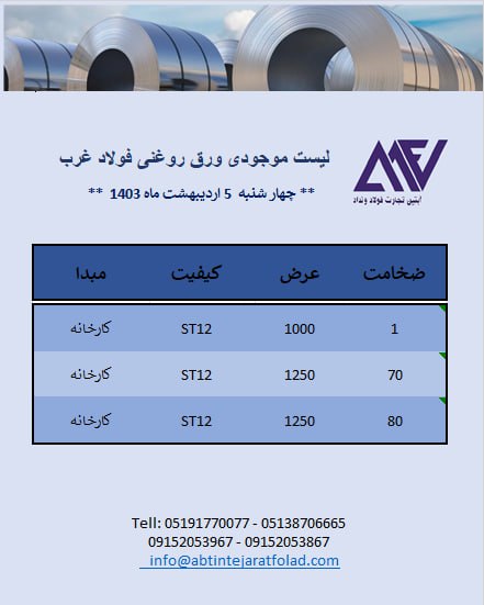 ✳️#آبتین_تجارت_فولاد_ونداد ⬅️ توزیع انواع ورق های فولادی از مبادی: 🔸ورق روغنی فولاد غرب آسیا 🔸ورق سیاه گیلان 🔸ورق سیاه مبارکه 🔸ورق گالوانیزه #جهت_مشاهده_پروفایل_آبتین_تجارت_فولاد_ونداد👇🏻 📌https://foolad24.com/profile/11718 #جهت_مشاهده_اعلام_موجودی_ آبتین_تجارت_فولاد_ونداد👇🏻 https://foolad24.com/profile/11718/inventory ☎️ 05191770077 ☎️ 05138706667 📱09152053867 📱09152053967 https://t.me/abtintejaratfuoladvandad