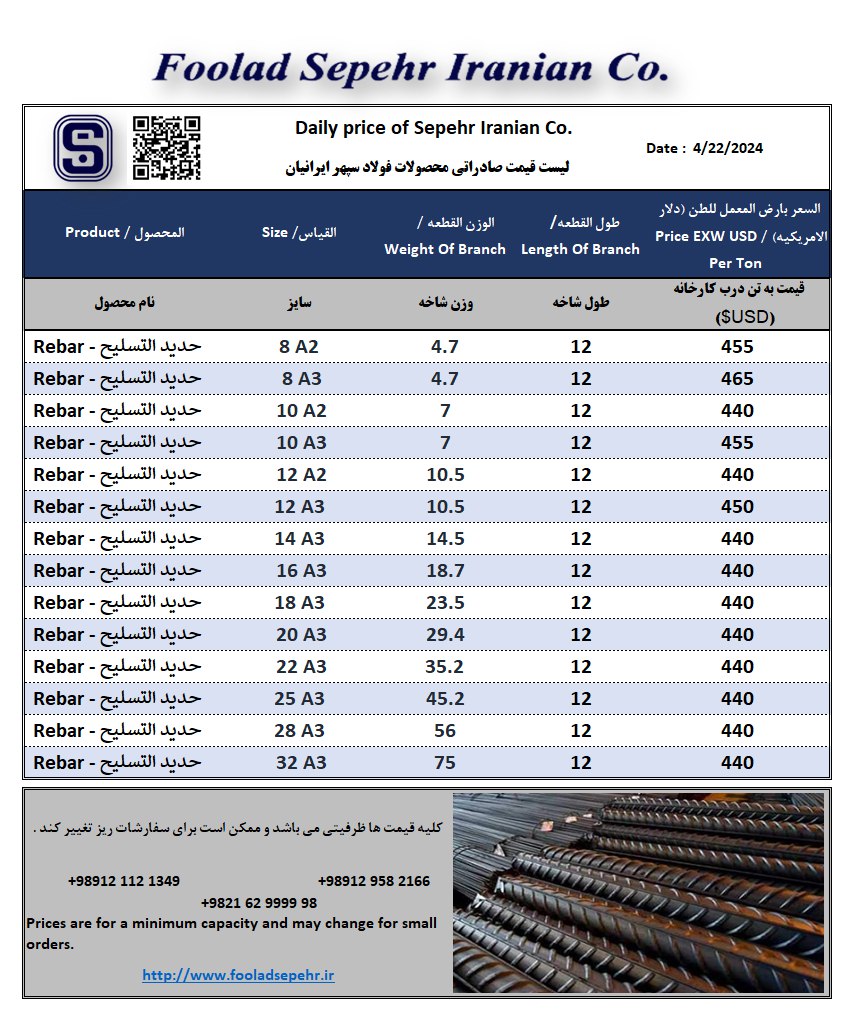 شرکت فولاد سپهر ایرانیان قادر به تولید و عرضه انواع محصولات فولادی با نازل ترین قیمت و بهترین کیفیت می باشد. تعهدات فولاد سپهر ایرانیان : ـــ پذیرش سفارش در تناژ بالا ـــ بارگیری سریع از درب کارخانه ـــ کلیه محصولات مطابق با استانداردهای ملی و بین المللی مورد تست قرار می گیرد ـــ تولید با بالاترین کیفیت و پایین ترین قیمت ـــ بدون خرج انبار داری 📱 ۰۹۱۲۹۵۸۲۱۶۶ 📱 ۰۹۱۲۱۱۲۱۳۴۹ 📍 کارخانه : اتوبان تهران ساوه، سه راه آدران، شهرک زواره ای خیابان هشتم، کوچه دوم، پلاک 110 لینک سایت : https://www.fooladsepehr.ir/ کانال تلگرام : https://t.me/Fooladsepehr_Export https://t.me/FooladsepehrIranian