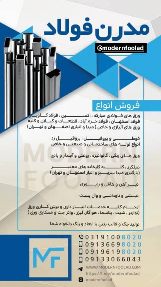 📣 جهت اطلاع از قیمت کارخانه های زیر 👇👇 تماس حاصل فرمایید. 🔹 بافق یزد 🔹 زاگرس 🔹 اروند 🔹 خلیج 🔹 آریان فولاد 🔹راد همدان 🔹کاوه تیکمه داش 🔹شاهین بناب 🔹ظفر بناب 🔹ذوب آهن اصفهان 🔹فولاد خراسان ( نیشابور ) 🔹سرمد ابر کوه 🔹تیر آهن ذوب اهن 🔹و سایر کارخانجات 🕹🕹 مدرن فولاد دارای انبار تخصصی ورق در شاپور 🕹🕹 🏗کاویان 🏗اکسین 🏗فولاد مبارکه 🏗خرم آباد 🏗 فولاد اصفهان ❌❌ بهترین قیمت ها را از ما بخواهید ❌❌ 📞03191008020 ☎️09196198020 ☎️09136698020 ☎️09135898020 🌐 www.modernfoolad.com 🌐 https://t.me/modernfoolad 🌐 https://chat.whatsapp.com/IVtzMuLZXTJ9Bl7sxlqmnd