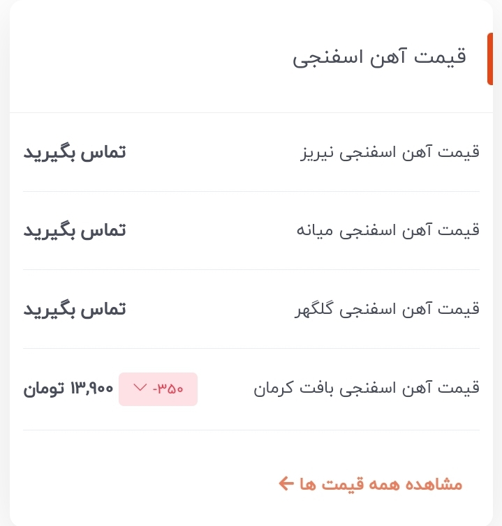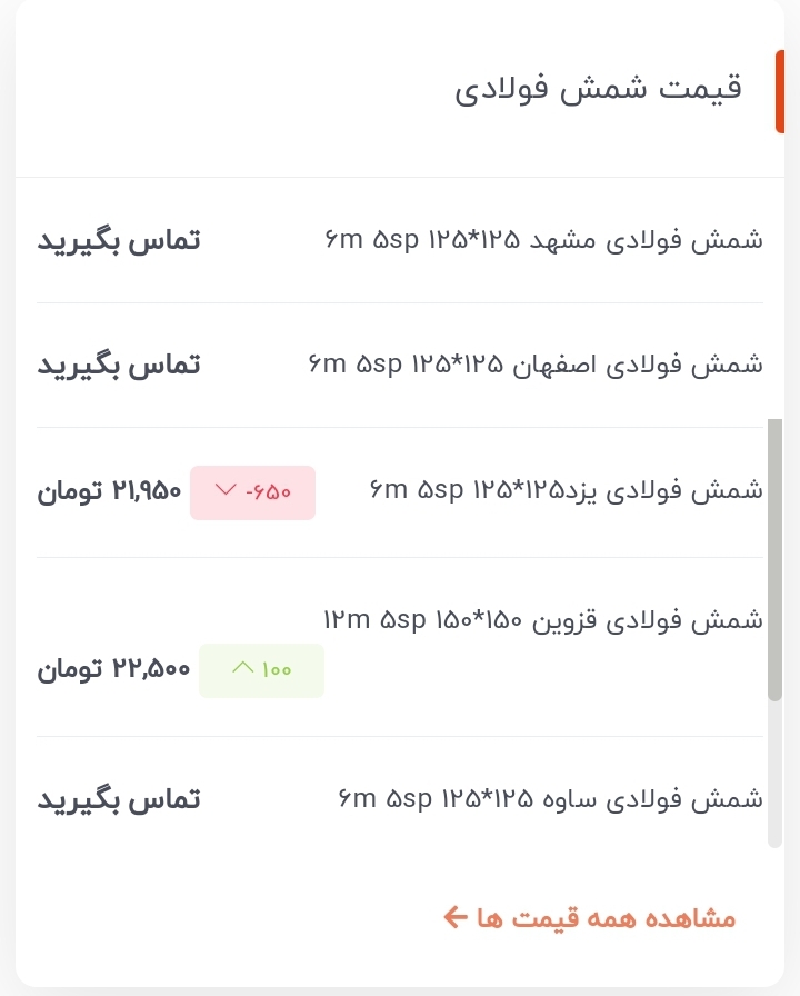 #فولاد_ظفر_بناب 🔸 میلگرد ۸ آجدار: ۲۸۱۰۰۰﷼ 🔸 میلگرد ۱۰و۱۲ آجدار: ۲۷۹۰۰۰﷼ 🔸️ میلگرد ۱۴تا۳۲ آجدار: ۲۷۵۰۰۰﷼ #تیرآهن 🔸️ تیرآهن ۱۴ : ۲۸۱۰۰۰﷼ 🔸️ تیرآهن ۱۶ : ✅ تخفیف پای آدرس 🔺افزایش۱۰۰تومانی ☎️ 041-37731232 📱 0914-4222215 #آراد_فولاد_آذربایجان https://t.me/afa_steel