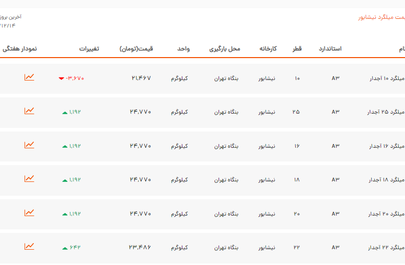 ⏱تاریخ : 14 اسفند 1402 🔵 قیمت میلگرد فولاد نیشابور 🔵 🏭 محل بارگیری : کارخانه ▪️14 | A3 | ==>25.600 ▪️16 | A3 | ==>25.600 ▪️18 | A3 | ==> 25,600 ▪️20 | A3 | ==> 25,600 ▪️22 | A3 | ==> 25,600 ▪️25 | A3 | ==> 25,600 ▪️28 | A3 | ==> 25,600 📞 021-91006007 🌐 www.ahanak.com 🆔https://t.me/ahanak واتساپ 🔗 https://whatsapp.com/channel/0029VaI4g5YLo4hdP2UA2O2A