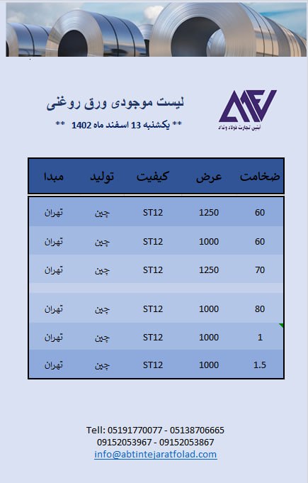 ⭐️#شرکت_بازرگانی_پرشین_آیرون #ورق_روغنی_فولادمبارکه 📍 #تهران 1️⃣ 65 عرض 1000 *ST14* 2️⃣ 70عرض 828 *ST12* 3️⃣ 80 عرض 1250 *ST12* 4️⃣ 87 عرض 800 *E275* 5️⃣ 1/11 عرض 110 *TPC200* 6️⃣ 1/20عرض 1400 * ST14* 7️⃣ 1/20 عرض 1400 *ST14 گذشته* 8️⃣ 1.20 عرض 1400 *ST14* 9️⃣ 1.20 عرض 1400 *ST14 تاریخ گذشته* 0️⃣1️⃣ 2 عرض 1200 *ST12* ——————————————- #ورق_روغنی_فولادغرب 📍 #تهران 1️⃣ 40 عرض 1000 *St12* 2️⃣ 40عرض 1250 *St12* 3️⃣ 50 عرض 1000 *St12* 4️⃣ 50 عرض 1250 *St12* 5️⃣ 70 عرض 1000 *St12* ——————————————— #ورق_اسیدشویی_مبارکه 📌 #تهران 2 عرض 1200 *SAPH440* ———————————————- #ورق_اسیدشویی_مبارکه 📌 #تهران 2 عرض 1200 *SAPH440* ————————————————- #میلگرد_فولادامین_تیکمه_داش 📍 #درب_کارخانه 1️⃣ میلگرد A2 آجدار سایز 8 قیمت 28,000 2️⃣ میلگرد A2 آجدار سایز 10 قیمت 27,700 3️⃣ میلگرد A3 آجدار سایز 10 قیمت 28,000 4️⃣ میلگرد A3 آجدار سایز 12 قیمت 27,700 5️⃣ میلگرد A3 آجدارسایز 14 الی 32 قیمت 27,300 ————————————————— #جهت_مشاهده_پروفایل_پرشین_آیرون https://foolad24.com/profile/7424 #جهت_مشاهده_اعلام_موجودی_پرشین_آیرون https://foolad24.com/profile/7424/inventory ☎️02140770074 📲 09125359973 🌐 www.persianiron.ir 🆔 https://t.me/persianiron_2018 https://www.instagram.com/p/C1G8k2LsCuP/?igsh=NTc4MTIwNjQ2YQ==