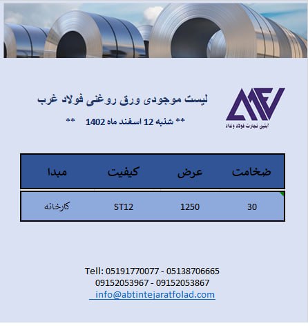 ⭐️#شرکت_بازرگانی_پرشین_آیرون #ورق_روغنی_فولادمبارکه 📍 #تهران 1️⃣ 65 عرض 1000 *ST14* 2️⃣ 70 عرض 1465 *ST14* 3️⃣ 70عرض 828 *ST12* 4️⃣ 80 عرض 1250 *ST12* 5️⃣87 عرض 800 *E275* 6️⃣ 1/11 عرض 110 *TPC200* 7️⃣ 1/20عرض 1400 * ST14* 8️⃣ 1/20 عرض 1400 *ST14 گذشته* 9️⃣ 1.20 عرض 1400 *ST14* 0️⃣1️⃣ 1.20 عرض 1400 *ST14 تاریخ گذشته* 1️⃣1️⃣ 2 عرض 1200 *ST12* ————————————- #ورق_روغنی_فولادغرب 📍 #تهران 1️⃣ 40 عرض 1000 *St12* 2️⃣ 40عرض 1250 *St12* 3️⃣ 50 عرض 1000 *St12* 4️⃣ 50 عرض 1250 *St12* 5️⃣ 70 عرض 1000 *St12* ——————————————— #ورق_روغنی_چین 📍 #تهران 🚩 60 عرض 1000 *نرم* 🚩 60 عرض 1250 *نرم* 🚩 1/25 عرض 1000 *نرم* ——————————————— #ورق_اسیدشویی_مبارکه 📌 #تهران 2 عرض 1200 *SAPH440* —————————————— #ورق_روغنی_mmk 📍 #تهران ⬅️2 عرض 1000 *ST12*➡️ ➖یک رول➖ ———————————————- #جهت_مشاهده_پروفایل_پرشین_آیرون https://foolad24.com/profile/7424 #جهت_مشاهده_اعلام_موجودی_پرشین_آیرون https://foolad24.com/profile/7424/inventory ☎️02140770074 📲 09125359973 🌐 www.persianiron.ir 🆔 https://t.me/persianiron_2018 https://www.instagram.com/p/C1G8k2LsCuP/?igsh=NTc4MTIwNjQ2YQ==