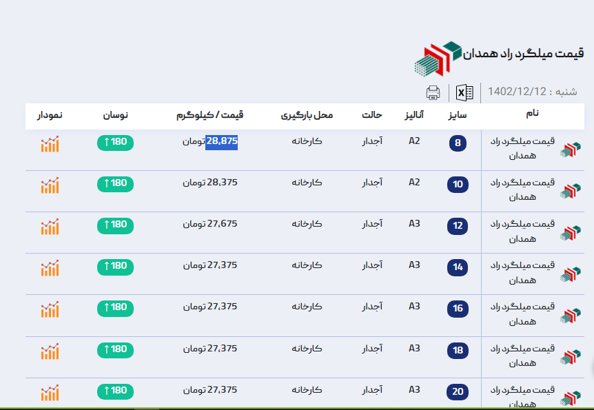⏱تاریخ : 12 اسفند 1402 🔵 قیمت میلگرد آجدار راد همدان 🔵 🏭 محل بارگیری : کارخانه ▪️8 | A2 | ==> 28,875 ▪️10 | A2 | ==> 28,375 ▪️12 | A3 | ==> 27,675 ▪️14 | A3 | ==> 27,375 ▪️16 | A3 | ==> 27,375 ▪️18 | A3 | ==> 27,375 ▪️20 | A3 | ==> 27,375 ▪️22 | A3 | ==> 27,375 ▪️25 | A3 | ==> 27,425 ▪️28 | A3 | ==> 27,425 📞 021-91006007 🌐 www.ahanak.com 🆔https://t.me/ahanak واتساپ 🔗 https://whatsapp.com/channel/0029VaI4g5YLo4hdP2UA2O2A