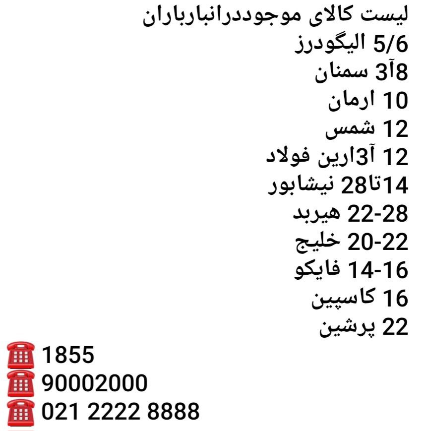 🗓 امروز سهشنبه ۰۱ اسفند ماه ۱۴۰۲ ✅قیمت انوع محصولات فولادی (بنگاه اصفهان) ✅قیمت ها با تایید میباشد. (انبار آهن آلات پورجم با باسکول تمام. الکترونیک 60تنی) راه های ارتباطی با ما : ☎️ 0314202 ☎️ 03133869211 ☎️ 03133869212 تیر آهن ذوب آهن 12 50,000,000 تیر آهن ذوب آهن 14 44,500,000 تیر آهن ذوب آهن 16 61,000,000 تیر آهن ذوب آهن 18 63,500,000 تیر آهن ذوب آهن20 92,000,000 تیر آهن ذوب آهن22 105,000,000 تیر آهن ذوب آهن24 119,000,000 تیر آهن ذوب آهن27 131,000,000 تیر آهن ذوب آهن30 163,000,000 ✅ کلیه محصولات، بارگیری سریع، آماده ارسال