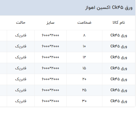 6,5 ساده 3sp : 6,5 ساده ساختمانى : *10 آرمان آسيا مشكى : 10 آرين A2 مشكى : 12 آرين A2 مشكى : 10 آرین A3 مشکی : 12 آرین A3 مشکی : 10گروه ملی A3 مشکی : 12 هیربد A3 مشکی : 14 نيشابور مشكى : 16 نیشابور مشکی : 18 نیشابور مشکی : 20 نیشابور مشکی : 22 نیشابور مشکی : 25 نیشابور مشکی : 28 نیشابور مشکی : 14 ذوبی مشکی : 16 ذوبی مشکی : 18 ذوبی مشکی : 20 ذوبی مشکی : 22 ذوبی مشکی : 25 ذوبی مشکی : 28 ذوبی مشکی : 32 ذوبی مشکی : 10میانه مشکی : 16میانه مشکی : 18میانه مشکی : 20میانه مشکی : 16 اَبهر مشکی : 20 اَبهر مشکی : 14 اَبرکوه مشکی : 16 اَبرکوه مشکی : 18 اَبرکوه مشکی : 20 اَبرکوه مشکی : 22 اَبرکوه مشکی : 25 اَبرکوه مشکی : 32 اَبرکوه مشکی : 16 کاشان مشکی : 16 اَمیر کبیر مشکی : 28 اَمیر کبیر مشکی :