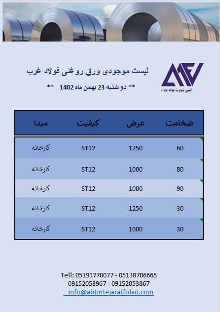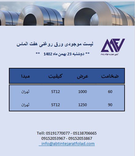 🔰روغــنى فولاد مباركه🔰 🔴1*1000___st12 🔴1*1250___st12 🔴1.25*1000___st12 🔴1.25*1250___st12 🔴1.5*1000___st12 🌐اصفهان🌐 شماره تماس: 📱09131041643 📱09135702853 ☎️03135652878