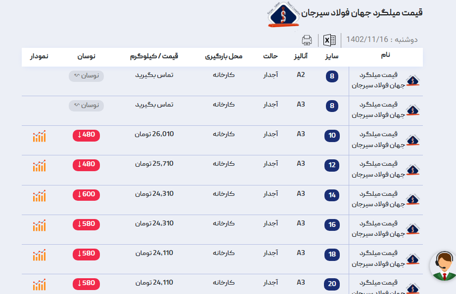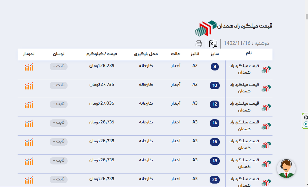 محصول قیمت (با مالیات) دوشنبه 1402/11/16 ساعت 12:10 میلگرد آجدار 8 A2 ظفر بناب 26,410 میلگرد آجدار 10 A2 ظفر بناب 26,200 میلگرد آجدار 12 A3 ظفر بناب 26,200 میلگرد آجدار 14 A3 ظفر بناب 25,800 میلگرد آجدار 16 A3 ظفر بناب 25,800 میلگرد آجدار 18 A3 ظفر بناب 25,800 میلگرد آجدار 20 A3 ظفر بناب 25,800 میلگرد آجدار 22 A3 ظفر بناب 25,800 میلگرد آجدار 25 A3 ظفر بناب 25,800 میلگرد آجدار 28 A3 ظفر بناب 25,800 میلگرد آجدار 12 A3 ذوب آهن اصفهان 26,400 میلگرد آجدار 14 A3 ذوب آهن اصفهان 25,600 میلگرد آجدار 16 A3 ذوب آهن اصفهان 25,600 میلگرد آجدار 18 A3 ذوب آهن اصفهان 25,000 میلگرد آجدار 20 A3 ذوب آهن اصفهان 24,600 میلگرد آجدار 22 A3 ذوب آهن اصفهان 24,700 میلگرد آجدار 25 A3 ذوب آهن اصفهان 25,000 میلگرد آجدار 28 A3 ذوب آهن اصفهان 24,100 میلگرد آجدار 14 A3 نیشابور بنگاه تهران 24,300 میلگرد آجدار 16 A3 نیشابور بنگاه تهران 24,300 میلگرد آجدار 18 A3 نیشابور بنگاه تهران 24,300 میلگرد آجدار 20 A3 نیشابور بنگاه تهران 24,300 میلگرد آجدار 22 A3 نیشابور بنگاه تهران 24,300 میلگرد آجدار 25 A3 نیشابور بنگاه تهران 24,300 میلگرد آجدار 28 A3 نیشابور بنگاه تهران 24,300 میلگرد آجدار 14 A3 نیشابور کارخانه 23,800 میلگرد آجدار 16 A3 نیشابور کارخانه 23,800 میلگرد آجدار 18 A3 نیشابور کارخانه 23,800 میلگرد آجدار 20 A3 نیشابور کارخانه 23,800 میلگرد آجدار 22 A3 نیشابور کارخانه 23,800 میلگرد آجدار 25 A3 نیشابور کارخانه 23,800 میلگرد آجدار 28 A3 نیشابور کارخانه 23,800 میلگرد آجدار 14 A3 فولاد پارس سیستان 25,800 میلگرد آجدار 16 A3 فولاد پارس سیستان 25,800 میلگرد آجدار 18 A3 فولاد پارس سیستان 25,800 میلگرد آجدار 10 A2 خرمدشت 25,200 میلگرد آجدار 10 A3 خرمدشت 25,310 میلگرد آجدار 12 A2 خرمدشت 25,200 میلگرد آجدار 12 A3 خرمدشت 25,310 📡 راه های ارتباطی در دیجی اهن: ☎️ شماره تماس: شماره چهار رقمی تهران 1849 شهرستانها 02186020094 instagram.com/digi.ahan :اینستاگرام🆔 🌐وبسایت: www.digiahan.com ✅تلگرام: https://t.me/Digiahan1849