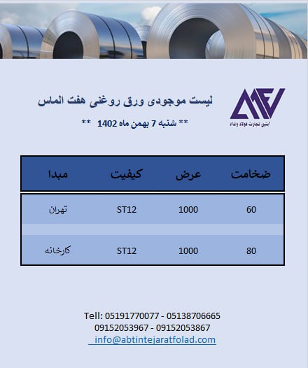 ✳️#آبتین_تجارت_فولاد_ونداد ⬅️ توزیع انواع ورق های فولادی از مبادی: 🔸ورق روغنی فولاد غرب آسیا 🔸ورق سیاه گیلان 🔸ورق سیاه مبارکه 🔸ورق گالوانیزه #جهت_مشاهده_پروفایل_آبتین_تجارت_فولاد_ونداد👇🏻 📌https://foolad24.com/profile/11718 #جهت_مشاهده_اعلام_موجودی_ آبتین_تجارت_فولاد_ونداد👇🏻 https://foolad24.com/profile/11718/inventory ☎️ 05191770077 ☎️ 05138706667 📱09152053867 📱09152053967 https://t.me/abtintejaratfuoladvandad