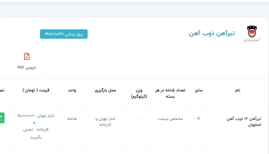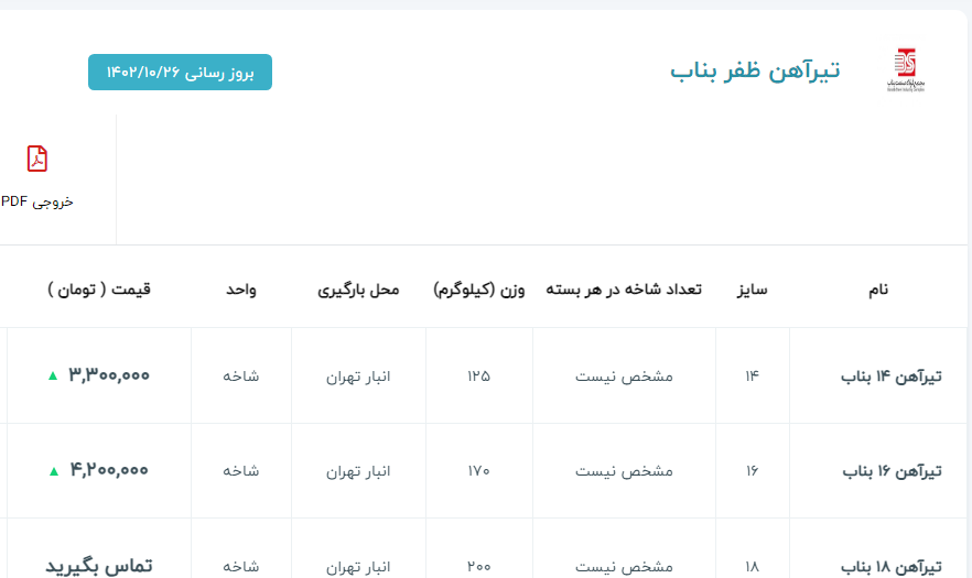 اعلام موجودی میلگرد آهن یاب لیست کالای میلگرد نورد آریان فولاد : 📅 سه شنبه : ۱۴۰۲/۱۰/۲۶ (افزایش قیمت) ♦️ میلگرد ۱۰ A3 💵23600 تومان 📈 50 ♦️میلگرد ۱۲ A3 💵23600 تومان 📈 50 ♦️میلگرد ۱۴ A3 💵23400 تومان 📈 50 ♦️ میلگرد ۱۶ A3 💵23400 تومان 📈 50 ♦️میلگرد ۱۸ A3 💵23400 تومان 📈 50 ♦️ میلگرد ۲۰ A3 💵23300 تومان. 📈 50 ♦️میلگرد ۲۵ A3 💵23300 تومان 📈 50 ♦️ میلگرد ۱۲ A2 💵23400 تومان 📈 50 ♦️میلگرد ۱۰ A2 💵23500 تومان 📈 50