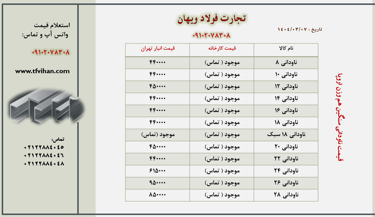 💫 هو الرزاق 💫 ⚜️ تجارت فولاد ويهان ⚜️ قیمت انواع ناودانی موجود كارخانه و انبار درخشان تهران 1404/03/4 قيمت ناودانى سنگين هم وزن اروپا استاندارد DIN1026 استعلام قيمت و کسب اطلاعات بيشتر 📱📱 واحد فروش ٠٩١٠٢٠٧٨٣٠٨ ٠٩١٠٢٠٧٨٣٠٨ خانم مقدم ♦️♦️♦️♦️♦️♦️♦️♦️♦️ ♦️♦️♦️♦️♦️♦️♦️♦️ ارتباط با واحد فروش ☎️021-22884046 داخلی 114 ☎️021-22884045 داخلی 114 🟣🟣 ارائه تخفيف ويژه به اعضاي كانال تجارت فولاد ويهان 🟣🟣 https://t.me/tfvihan https://t.me/tfvihan 🌐www.tfvihan.com #ناودانى#نبشى#آهن#قيمت_ناودانى#ناودانى_سنگين