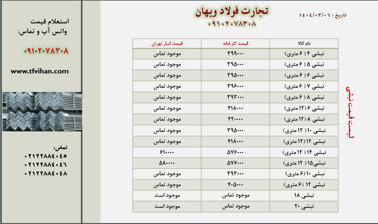 💫 هو الرزاق 💫 ⚜️ تجارت فولاد ويهان ⚜️ قیمت انواع نبشى موجودي كارخانه و انبار درخشان تهران 1404/03/06 ♣️♣️♣️♣️♣️♣️♣️♣️ ♣️♣️♣️♣️♣️♣️♣️♣️ ✅ انواع نبشى St37 - St52 - St44 موجود است استعلام قيمت و کسب اطلاعات بيشتر 📱📱 ارتباط با واحد فروش ٠٩١٠٢٠٧٨٣٠٨ خانم مقدم ♦️♦️♦️♦️♦️♦️♦️♦️♦️♦️ ارتباط با واحد فروش ☎️021-22884046 داخلی 114 ☎️021-22884045داخلی 114 🟣🟣 ارائه تخفيف ويژه به اعضاي كانال تجارت فولاد ويهان 🟣🟣 https://t.me/tfvihan https://t.me/tfvihan 🌐www.tfvihan.com