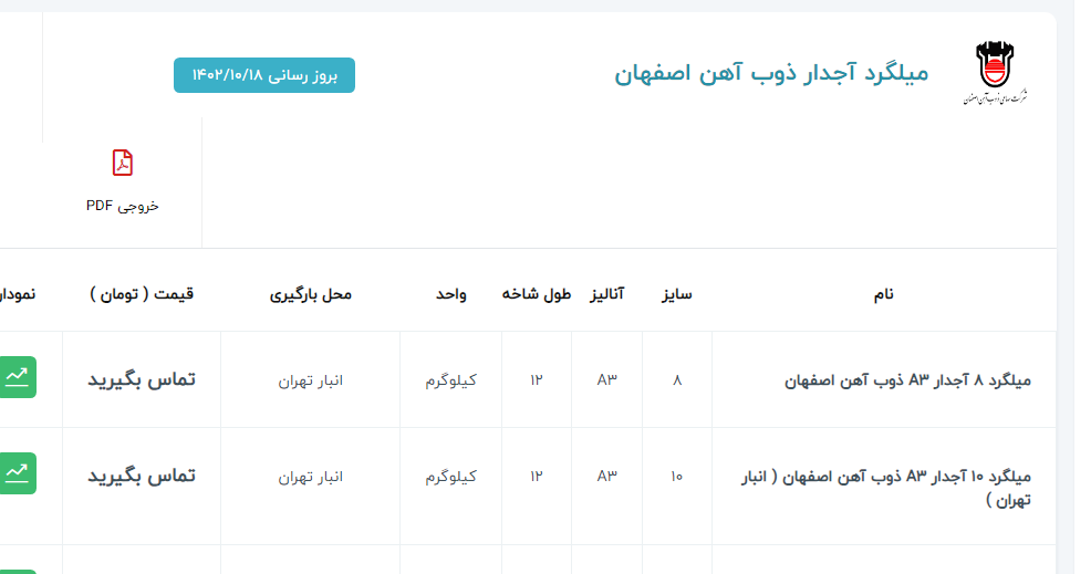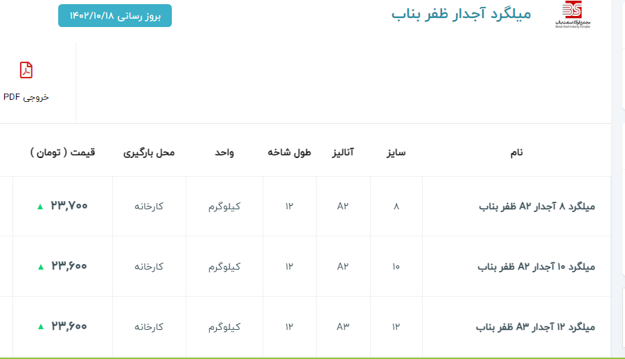 اعلام موجودی میلگرد آهن یاب لیست کالای فولاد ظفر بناب : 📅 دوشنبه : ۱۴۰۲/۱۰/۱۸ (ثبات قیمت) ♦️ میلگرد ۱۰ A2 💵23750 تومان ♦️ میلگرد ۱۲ A3 💵23750 تومان ♦️ میلگرد ۱۴ A3 💵23350 تومان ♦️ میلگرد ۱۶ A3 💵23350 تومان ♦️ میلگرد ۱۸ A3 💵23350 تومان ♦️ میلگرد ۲۰ A3 💵23350 تومان ♦️ میلگرد ۲۲ A3 💵23350 تومان ♦️ میلگرد ۲۵ A3 💵23350 تومان ♦️ میلگرد ۲۸ A3 💵23350 تومان ♦️ میلگرد ۸ A2 💵23950 تومان
