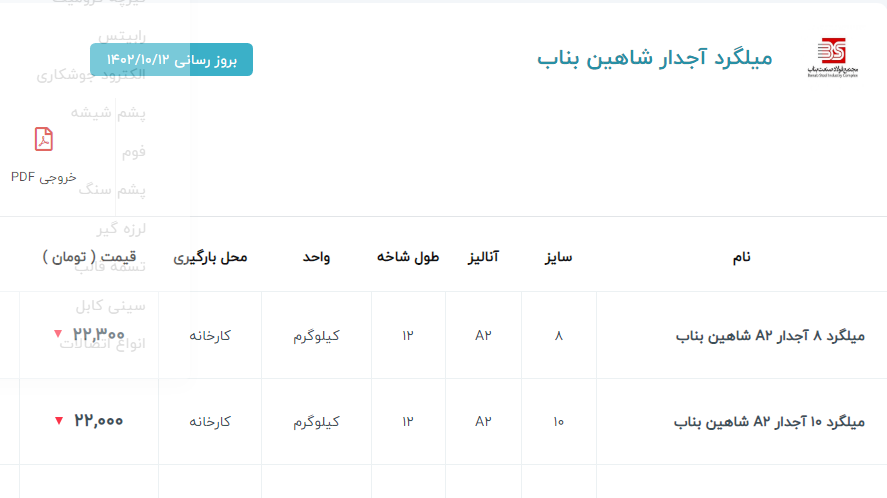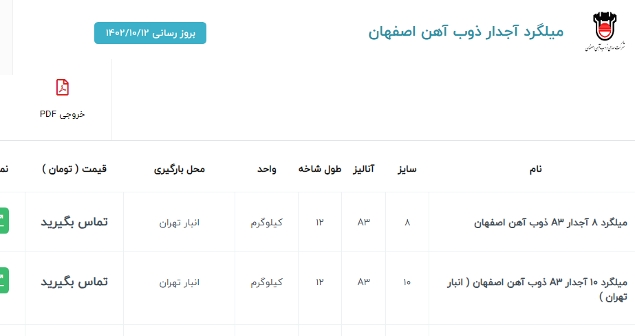 اعلام موجودی میلگرد اجدار آهن یاب لیست کالای میلگرد نورد آریان فولاد : 📅 سه شنبه : ۱۴۰۲/۱۰/۱۲ (ثبات قیمت) ♦️ میلگرد ۱۰ A3 💵23050 تومان ♦️میلگرد ۱۲ A3 💵23050 تومان ♦️میلگرد ۱۴ A3 💵22850 تومان ♦️ میلگرد ۱۶ A3 💵22850 تومان ♦️میلگرد ۱۸ A3 💵22850 تومان ♦️ میلگرد ۲۰ A3 💵22750 تومان ♦️میلگرد ۲۵ A3 💵22750 تومان ♦️ میلگرد ۱۲ A2 💵22850 تومان ♦️میلگرد ۱۰ A2 💵22950 تومان
