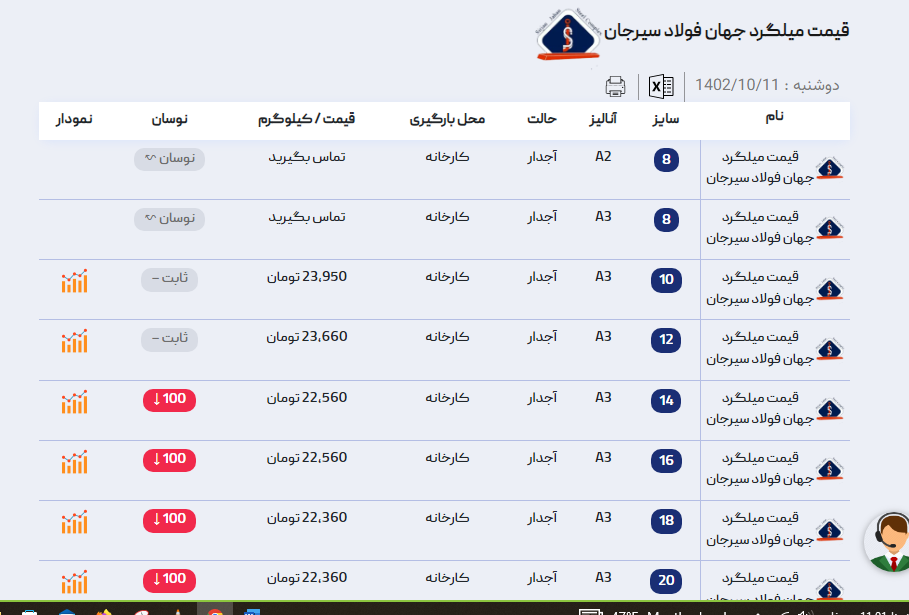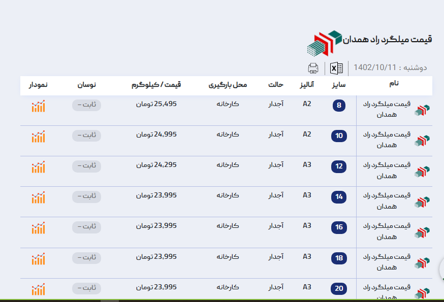 اعلام موجودی میلگرد اهن یاب لیست کالای فولاد ظفر بناب : 📅 دوشنبه : ۱۴۰۲/۱۰/۱۱ (ثبات قیمت) ♦️ میلگرد ۱۰ A2 💵23900 تومان ♦️ میلگرد ۱۲ A3 💵23900 تومان ♦️ میلگرد ۱۴ A3 💵23500 تومان ♦️ میلگرد ۱۶ A3 💵23500 تومان ♦️ میلگرد ۱۸ A3 💵23500 تومان ♦️ میلگرد ۲۰ A3 💵23500 تومان ♦️ میلگرد ۲۲ A3 💵23500 تومان ♦️ میلگرد ۲۵ A3 💵23500 تومان ♦️ میلگرد ۲۸ A3 💵23500 تومان ♦️ میلگرد ۸ A2 💵24100 تومان