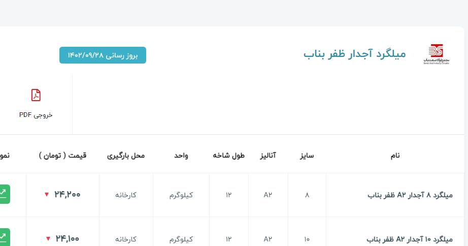 اعلام موجودی میلگرد آجدار آهن یاب ❇️ لیست کالای میلگرد نورد آریان فولاد : 📅 سه شنبه : ۱۴۰۲/۹/۲۸ (کاهش قیمت) ♦️ میلگرد ۱۰ A3 💵23400 تومان 📉 200 ♦️میلگرد ۱۲ A3 💵23400 تومان 📉 200 ♦️میلگرد ۱۴ A3 💵23200 تومان 📉 200 ♦️ میلگرد ۱۶ A3 💵23200 تومان 📉 200 ♦️میلگرد ۱۸ A3 💵23200 تومان 📉 200 ♦️ میلگرد ۲۰ A3 💵23100 تومان 📉 200 ♦️میلگرد ۲۵ A3 💵23100 تومان 📉 200 ♦️ میلگرد ۱۲ A2 💵23200 تومان 📉 200 ♦️میلگرد ۱۰ A2 💵23300 تومان 📉 200