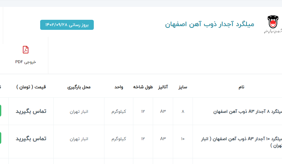 اعلام موجودی میلگردآجدار فولاد 369 🔷 فولاد 369 🔷 ⏱تاریخ : 28 آذر 1402 🔷 قیمت میلگرد هیربد زرندیه 🔷 🏭 محل بارگیری : کارخانه 🔷 10 | A2 |▫️ 23,400 🔷 12 | A3 |▫️ 23,300 🔷 14 | A3 |▫️ 22,950 🔷 16 | A3 |▫️ 22,950 🔷 18 | A3 |▫️ 22,900 🔷 20 | A3 |▫️ 22,900 🔷 22 | A3 |▫️ 22,900 🔷 25 | A3 |▫️ 22,900 🔷 28 | A3 |▫️ 22,950 🔷 32 | A3 |▫️ 22,950 📞 021-22210369 📞 021-22241369 🔷 داخلی 106 🌐 www.foolad369.com