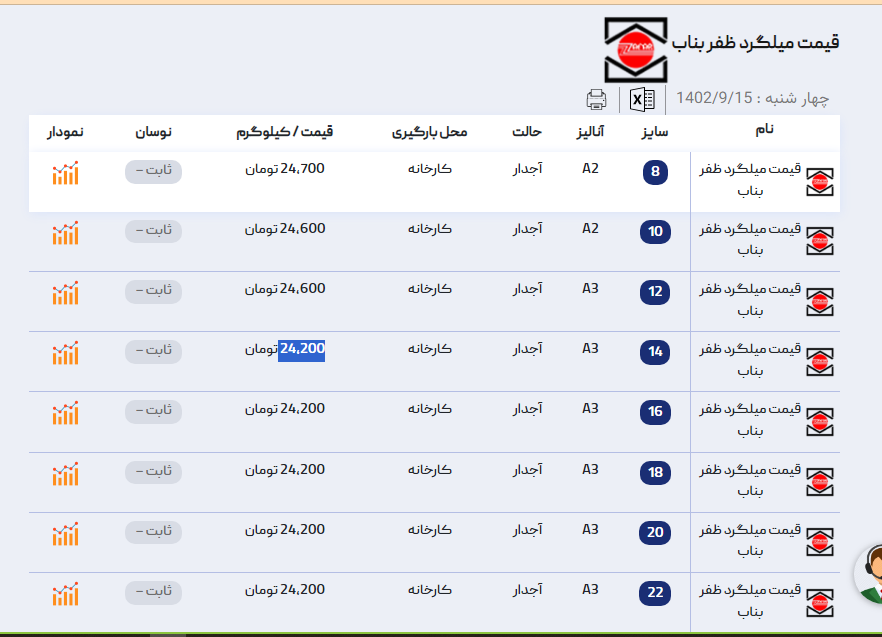 فولاد سعادت پاسارگاد (اصفهان)FSP, [15/09/1402 10:04] 💢میلگرد راد همدان◻️ثابت 14 تا 22 ⬅️ 23.995 تومان فولاد سعادت پاسارگاد (اصفهان)FSP, [15/09/1402 11:48] 💢میلگرد کیان کاشان ◻️ثابت 14 و 16 ⬅️ 23.700 تومان فولاد سعادت پاسارگاد (اصفهان)FSP, [15/09/1402 11:49] 💢میلگرد آناهیتا گیلان ◻️ثابت 14 تا 22 ⬅️ 23.400 تومان فولاد سعادت پاسارگاد (اصفهان)FSP, [15/09/1402 11:49] 💢میلگرد سیرجان حدید جنوب ◻️ثابت 14 تا 20 ⬅️ 22.700 تومان