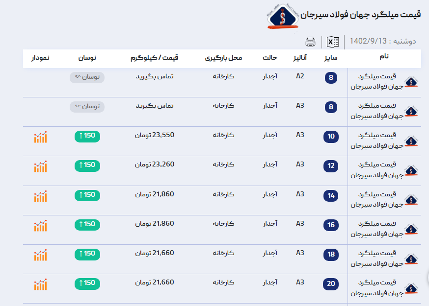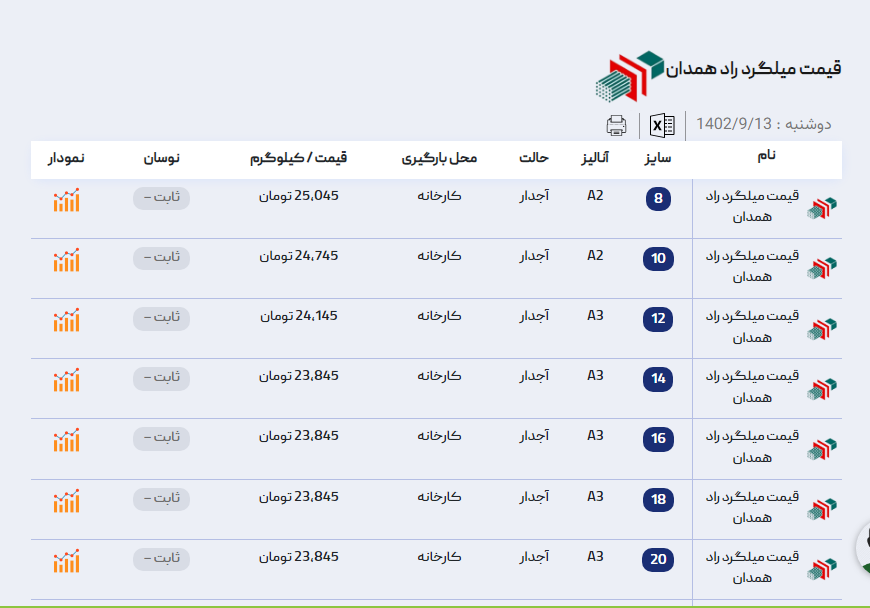 فولاد راد همدان سایز ۸ ۲۵۰۴۵۰ ﷼ سایز ۱۰ ۲۴۷۴۵۰ ﷼ سایز ۱۲ ۲۴۱۴۵۰ ﷼ سایز ۱۴-۲۲ ۲۳۸۴۵۰ ﷼ سایز ۲۵و۲۸ ۲۳۸۹۵۰﷼ ☑️تخفیف پای معامله