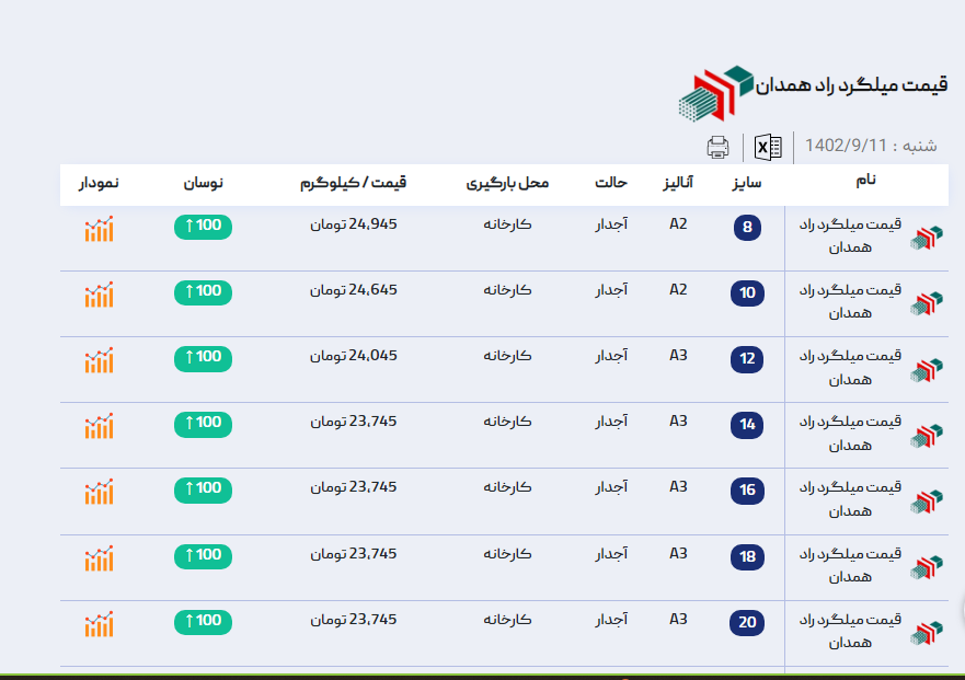▪️🌼🌼به نام خدا🌼🌼▪️ 1402/09/11 📊گرد6/5 بندیل 24200 📊گرد6/5 باز 25000 📊گرد8 ابهر 23000 📊گرد8 کلاف 27200 📊گرد10 کلاف 27200 📊گرد10 ابهر 21900 📊گرد10 ارین 22400 📊گرد12 ابهر 21900 📊گرد14ابرکوه 21750 📊گرد20ابرکوه 21900 📊گرد25 ابرکوه 21750 📊گرد14کاسپین. 21750 📊گرد16کاسپین 21750 📊گرد18 کاسپین. 21750 📊گرد20کاسپین 21750 📊گرد14اصفهان 24300 📊گرد16اصفهان 24300 📊گرد18اصفهان 24300 📊گرد32اصفهان 22800 📊گرد14نیشابور 23200 📊گرد16نیشابور 23200 📊گرد18نیشابور 23200 📊گرد20نیشابور 23200 📊گرد22نیشابور 23200 📊گرد25نیشابور 23200 📊گرد12میانه 23300 📊گرد14میانه 22300 📊گرد16میانه 22300 📊گرد18میانه 22300 📊گرد20میانه 22300 📊گرد22میانه 22300 📊گرد25میانه 22300 📊گرد10پردیس 23100 📊گرد12پردیس 22700 📊گرد14پردیس 21900 📊گرد16پردیس 21900 📊گرد18پردیس 21900 📊گرد20پردیس 21900 📊گرد22پردیس 21900 📊گرد25پردیس 21900 📊گرد28پردیس 22450 📊گرد32پردیس 22450 📊گرد18پرشین 21900 📊گرد20پرشین 21900 📊گرد12هیربد 22500 📊گرد14هیربد 21900 📊گرد16هیربد 21900 📊گرد18هیربد 📊گرد20هیربد 📊گرد22هیربد 21900 📊گرد25هیربد 21900 کلیه اجناس درب مغازه شادآباد میباشد 📁در صورت درخواست مشتری کلیه کالاها با فاکتور رسمی ارائه میگردد آدرس:تهران،بازارآهن شادآباد،مجتمع بهاران۲،بلوک ۳۳،پلاک ۱۰۰ تلفن: 66317671 لینک کانال:@milgrd_ghaffarii