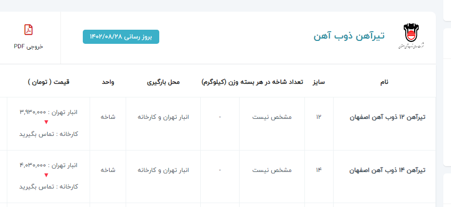 #رادین_پولاد_توسن_اسپادانا ⚜️#قیمت_تیر_ذوب_i7 تیرآهن 14 ____38.500.000ریال تیرآهن 16 ____45.000.000ریال تیرآهن 18 ____55.000.000ریال تیرآهن 20 ____69.000.000ریال ⚜️#قیمت_تیر_ذوب تیرآهن شاخه ای12____40.000.000ریال تیرآهن شاخه ای14____39.800.000ریال تیرآهن شاخه ای 16____45.500.000ریال تیرآهن شاخه ای 18____55.500.000ریال تیرآهن شاخه ای 20____71.000.000ریال تیرآهن شاخه ای 22___81.500.000ریال تیرآهن شاخه ای 24___92.500.000ریال تیرآهن شاخه ای 27____108.000.000ریال تیرآهن شاخه ای 30____130.000.000ریال ⚜️#قیمت_میلگرد_شاهین میلگرد8____246.000ریال میلگرد10____243.000ریال میلگرد12____243.000ریال میلگرد14____240.000ریال میلگرد16____240.000ریال میلگرد18____240.000ریال میلگرد20___240.000ریال میلگرد22____240.000ریال میلگرد25___240.000ریال میلگرد28___240.000ریال میلگرد32___240.000ریال ⚜️#قیمت_میلگرد_ظفر میلگرد8_239.500ریال میلگرد10_238.500ریال میلگرد12_238.500ریال میلگرد14_234.500ریال میلگرد16_234.500ریال میلگرد18_234.500ریال میلگرد20_234.500 ریال میلگرد22_234.500ریال میلگرد25_234.500ریال میلگرد28_234.500ریال میلگرد32_234.500ریال #جهت_مشاهده_پروفایل_رادین_پولاد_توسن_اسپادانا👇🏻 📌https://foolad24.com/profile/14665 #جهت_مشاهده_اعلام_موجودی_رادین_پولاد_توسن_اسپادانا👇🏻 https://foolad24.com/profile/14665/inventory شماره های تماس : 03134036 09925008927 09925008944 09925008932 09925008922 لینک های مرتبط با ما:🏻🏻 لینک وبسایت توسن فولاد (https://tosanfoolad.com/)لینک کانال توسن فولاد (https://t.me/tosan_foolad)لینک اینستاگرام توسن فولاد https://foolad24.com/dashboard/user/14665