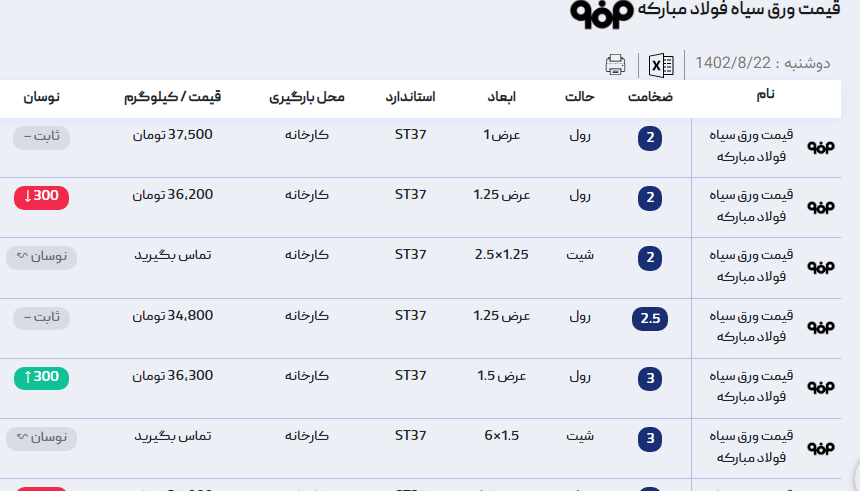 میلگرد ابرکوه: ۲۱۷۰۰ میلگرد سیرجان: ۲۱۷۰۰ میلگرد اروند: ۲۱۹۰۰ میلگرد گروه ملی: ۲۲۰۰۰ میلگرد خلیج: ۲۱۶۰۰