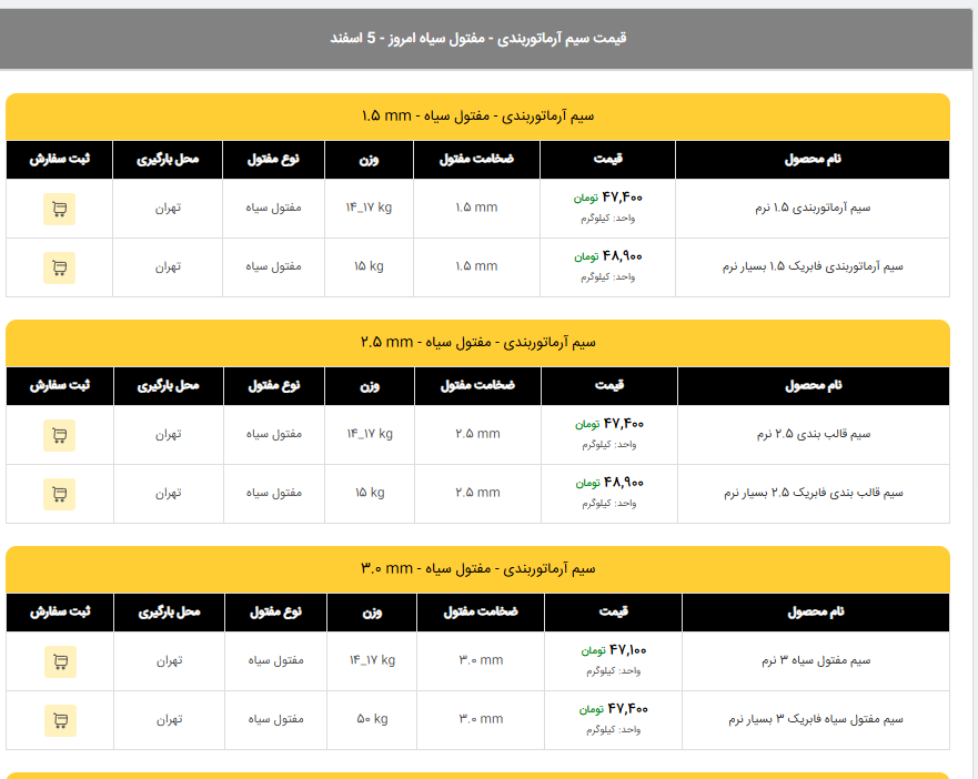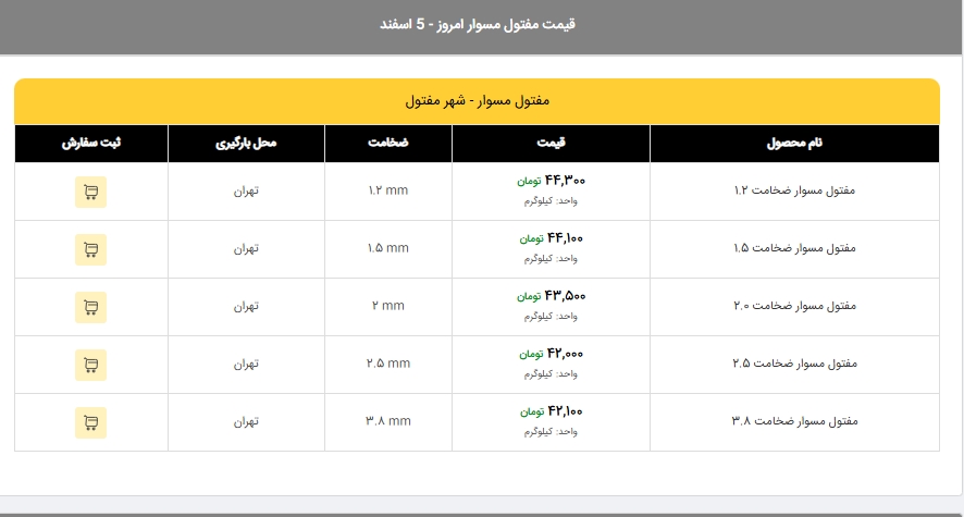 موجود در کارخانه نبشی ۴/۳ ——- ۳۹۵۰۰۰ نبشی ۴/۴——-۳۸۵۰۰۰ نبشی ۵/۴ ——۳۸۱۰۰۰ نبشی ۵/۵ ——-۳۸۱۰۰۰ نبشی ۶/۶ ——-۳۸۱۵۰۰ نبشی ۷/۷ ——- نبشی ۸/۸——-۳۸۱۰۰۰ نبشی ۱۰/۱۰——-۳۸۱۵۰۰ نبشی ۱۲/۱۲——-۳۸۱۵۰۰ نبشی ۵/۳ ——-۳۸۲۰۰۰ نبشی ۵/۴ ——۳۸۲۰۰۰