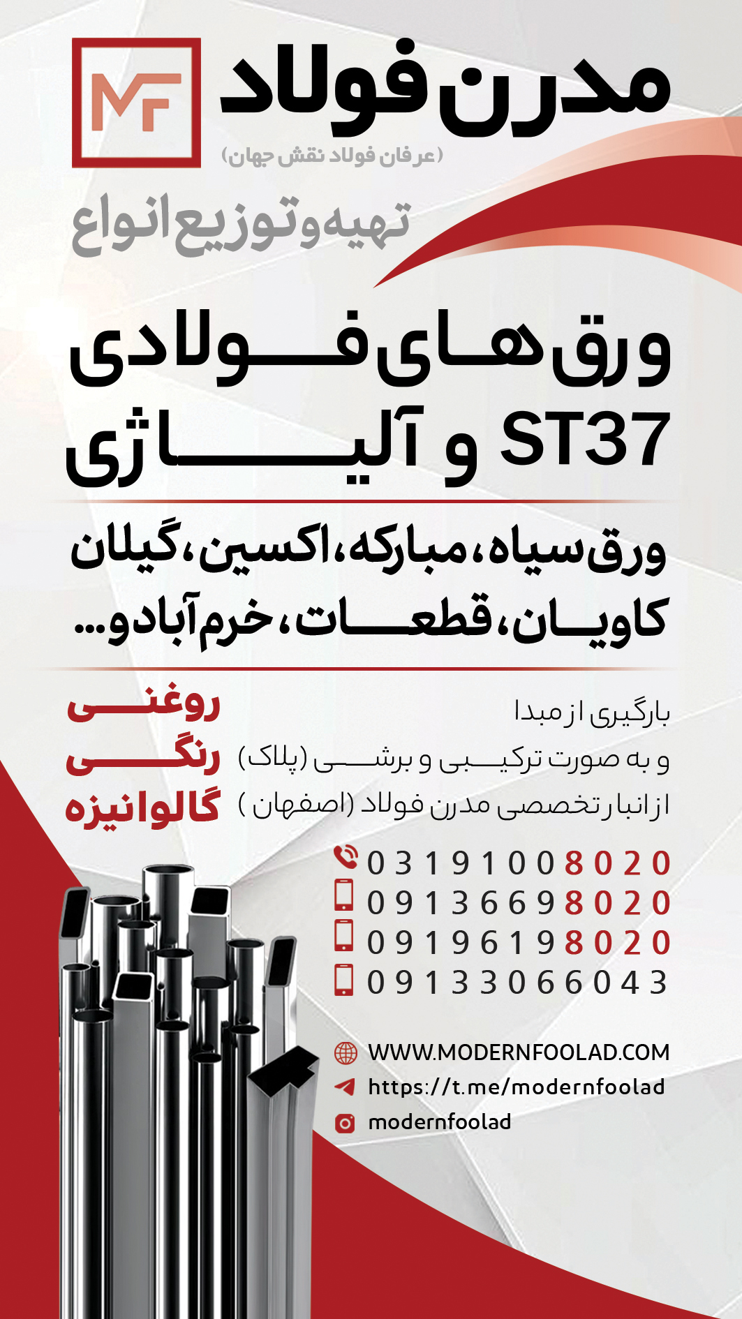 #كوير_آهن_نصف_جهان(ركنی) ✔️تامین کننده انواع ورق های: ◾️ورق سیاه ◾️ورق روغنی ◾️ورق گالوانیزه ◾️ ورق آلیاژی ◾️ انواع مقاطع طویل ( تیر آهن، میلگرد، نبشی، ناودانی، لوله) ◾️ورق های برش سوله ای، پوشش سوله، ورق های کرکره ای رنگی و ساده ◾️ انواع تسمه های نوردی و فابریک ◾️ پیچ و مهره ◾️تولید و تامین پروفیل Z و پروفیل C و قوطی در سایزهای مختلف __________________________________________________________________ جهت مشاهده اعلام موجودی کویر آهن نصف جهان https://t.me/kavir_ahan_nesfejahan بخش فروش: 📱۰۹۱۳۱۱۹۱۷۲۲ 📱۰۹۱۳۸۰۰۰۸۱۲ کارشناسان فروش: 📞 ۰۳۱-۹۱۰۰۳۰۳۱ داخلی ۱۱۲ https://zil.ink/kavir_ahan_nesfejahan https://t.me/kavir_ahan_nesfejahan Kavir.ahan.esfahan@gmail.com