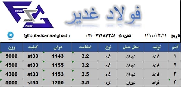 ورق سیاه از 2میل تا 15 میل به میزان ماهیانه بیش از 1000 تن به فروش میرسد. 5 الی 77187351_021 شرکت فولاد صنعت غدیر