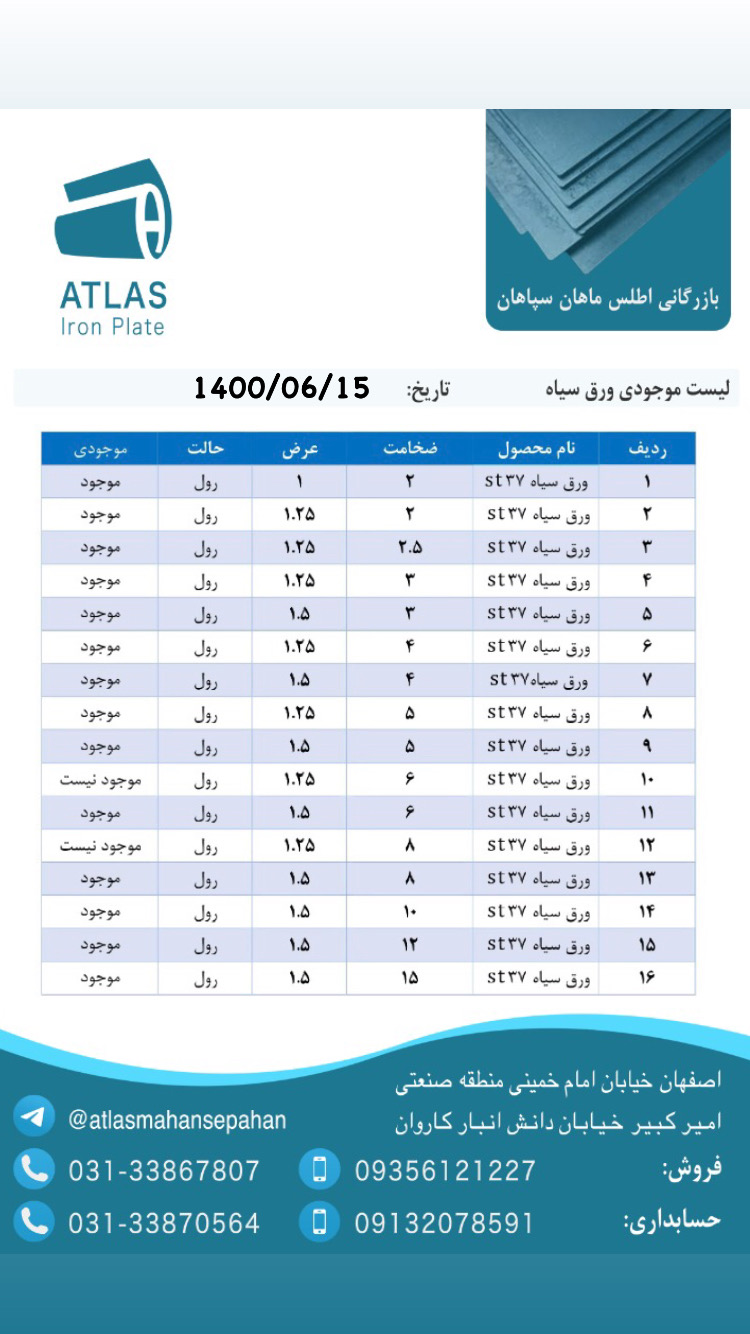 لیست موجودی ورق های سیاه https://t.me/Atlasmahansepahan شرکت بازرگانی اطلس ماهان مرجع خرید و فروش انواع ورق های فولادی اعم از سیاه -رنگی- گالوانیزه و... ☎️031 ...