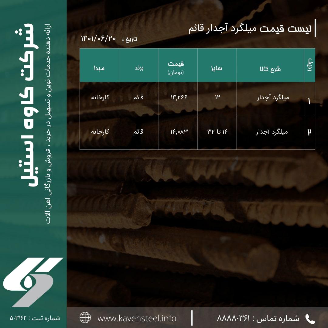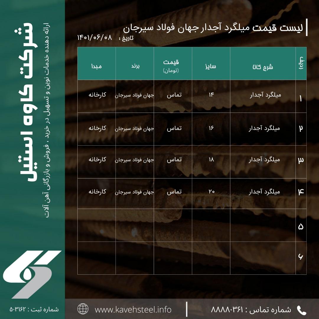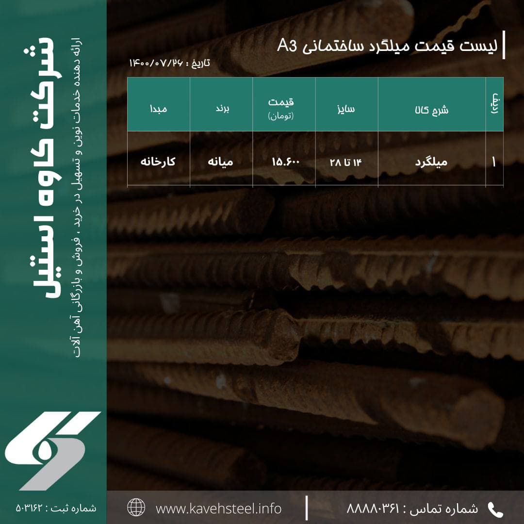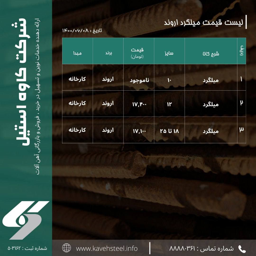 📌لیست قیمت #میلگرد (اروند) - کارخانه 🗓تاریخ : ۱۴۰۰/۰۶/۰۸ شماره های تماس : 📞 02188880361 📞02188780310