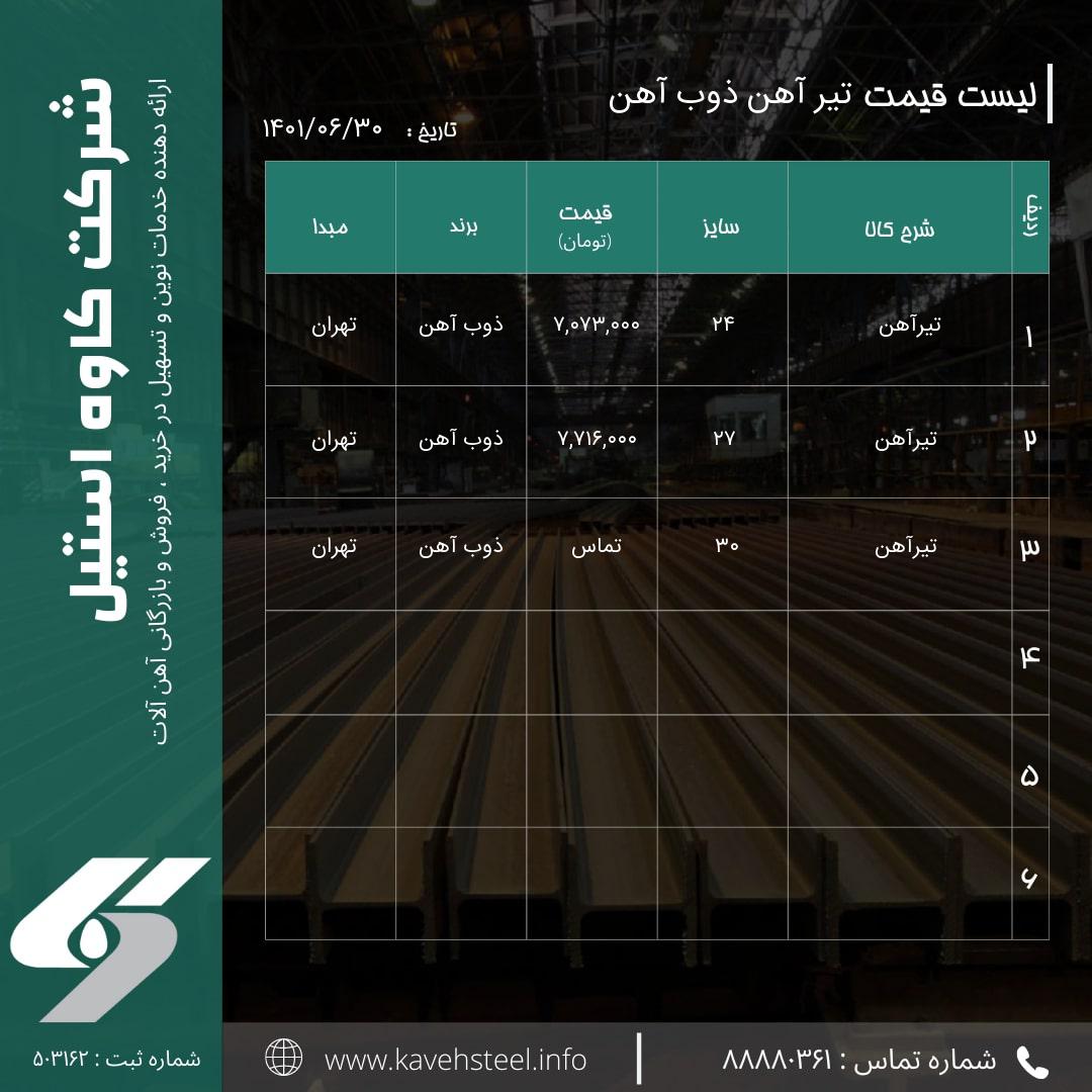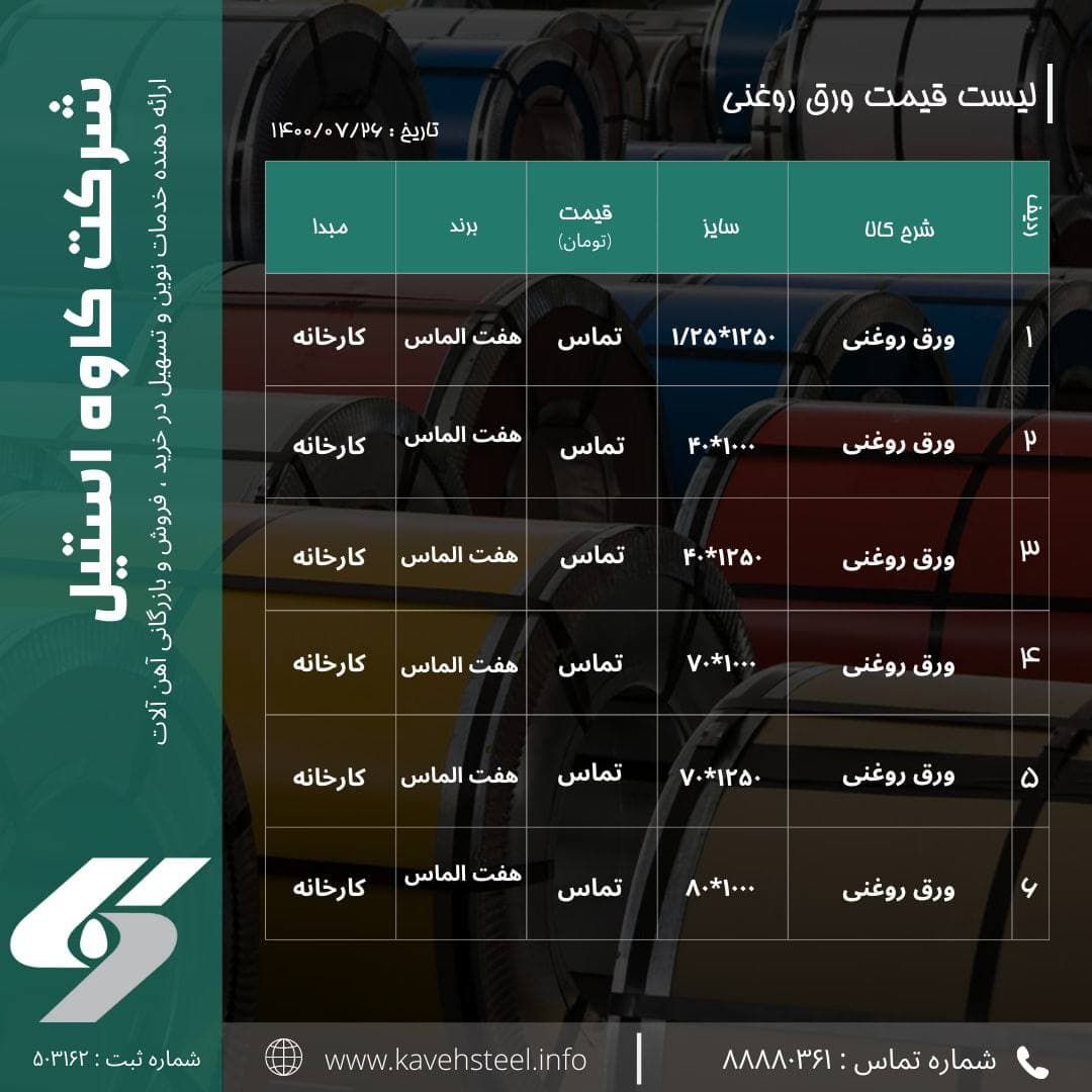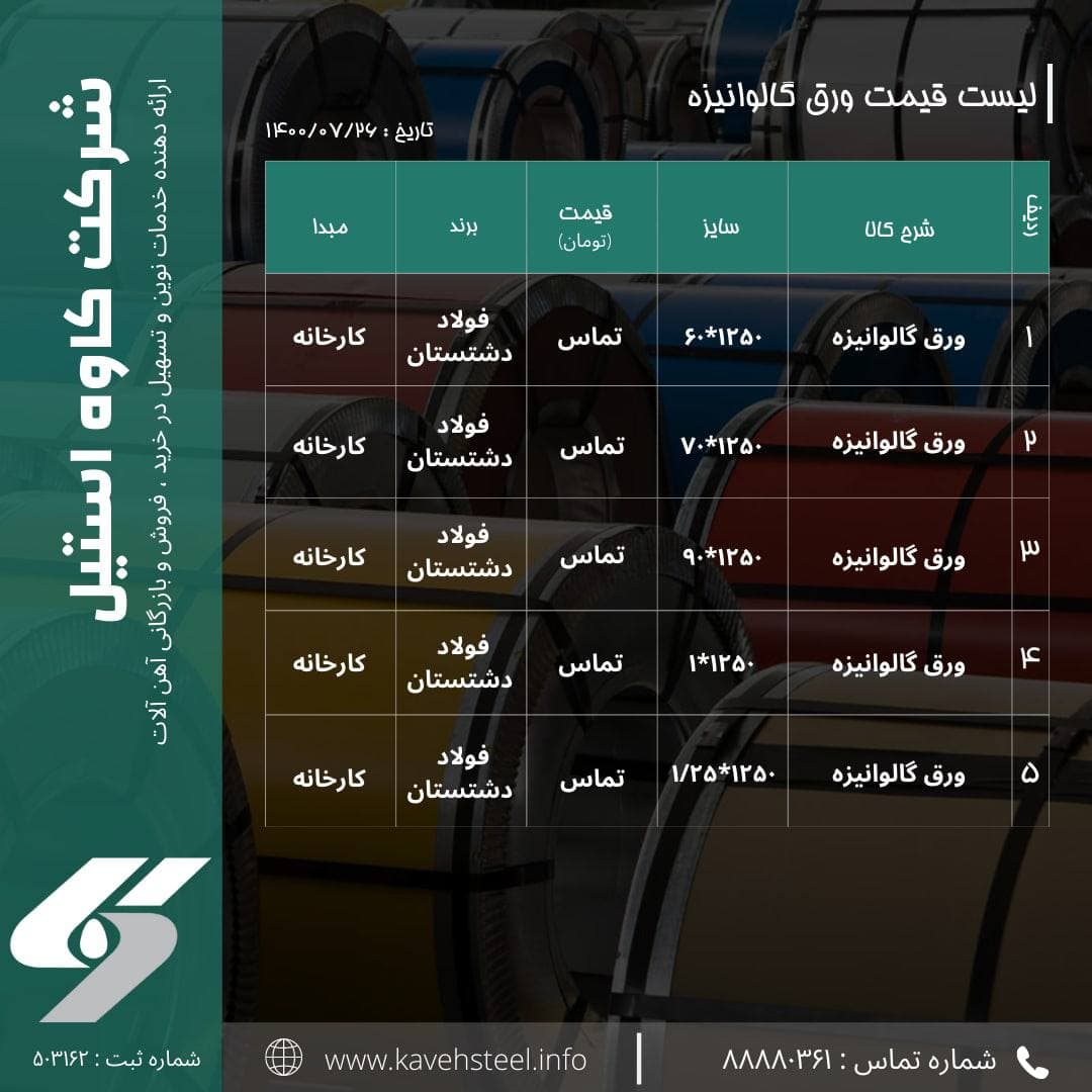 📌لیست قیمت ورق گالوانیزه سمنان 🗓تاریخ : ۱۴۰۱/۰۷/۰۹ شماره های تماس : 📞 02188880361 📞 02188780310 📌تمامی قیمت ها بدون احتساب 9% ارزش افزوده می باشد @steel_ka ...