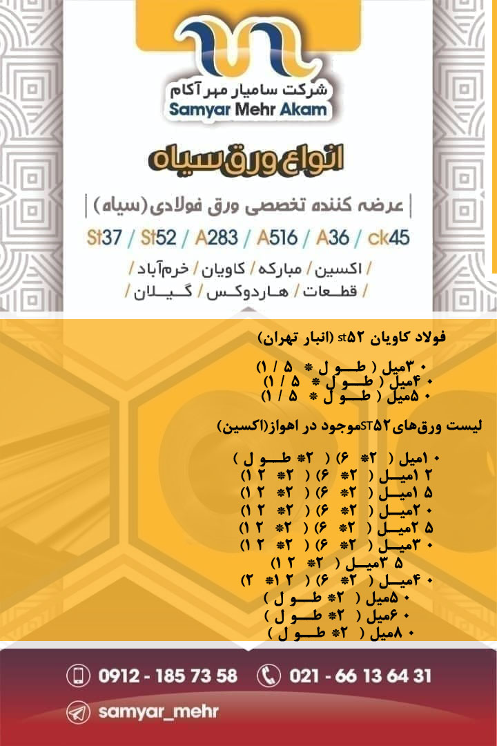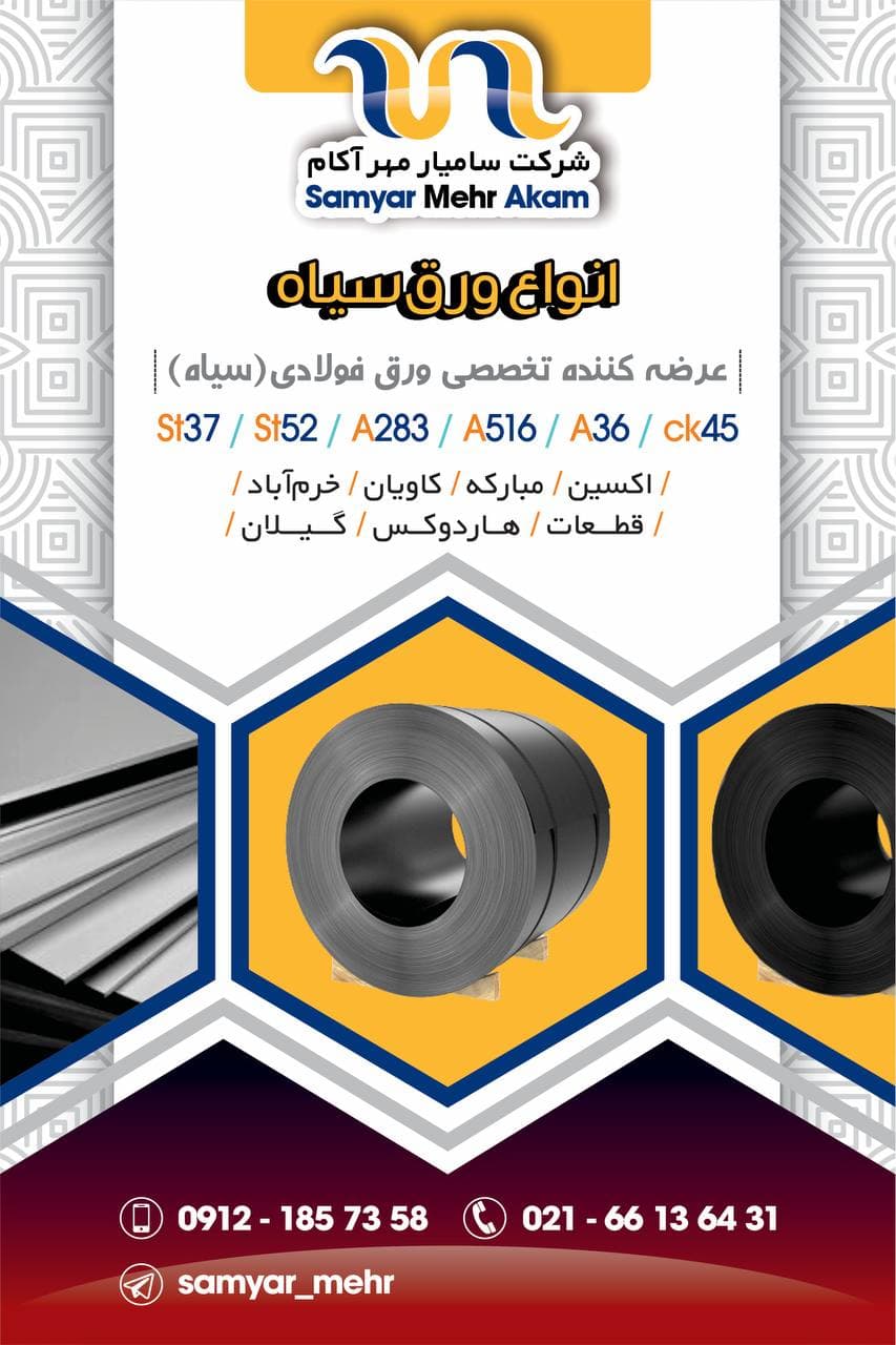 #سامیار_مهر_آکام 🔱عرضه کننده تخصصی ورق فولادی(سیاه)🔱 ❇️اکسین/مبارکه/کاویان/خرم آباد ❇️قطعات/هاردوکس/گیلان 📱0912 185 7358 ☎️021 66136431 🆔@samyar_mehr https: ...
