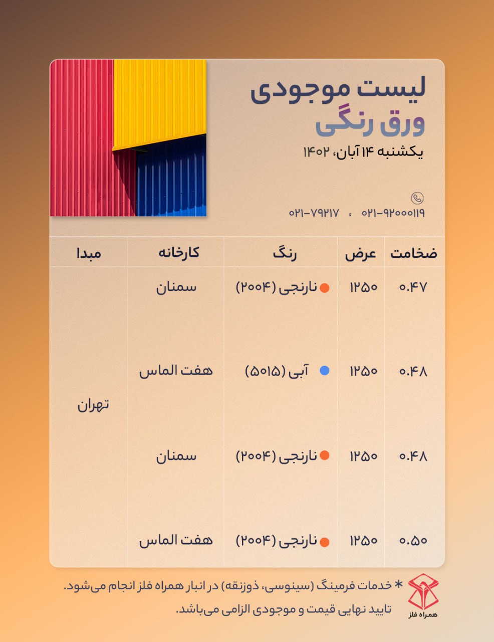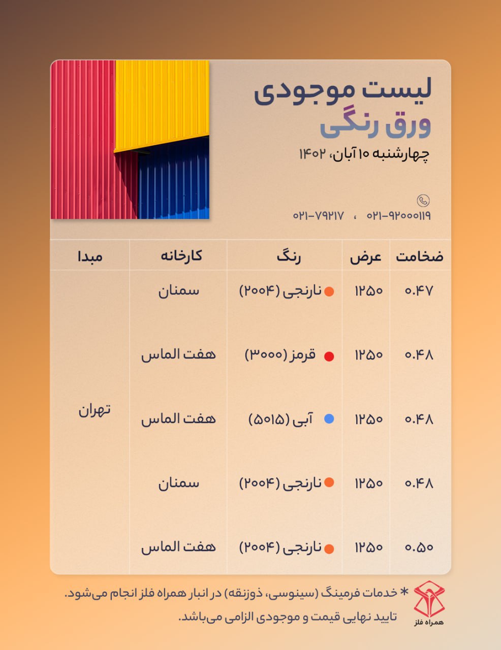 اعلام موجودی ورق گالوانیزه و رنگی همراه فلز