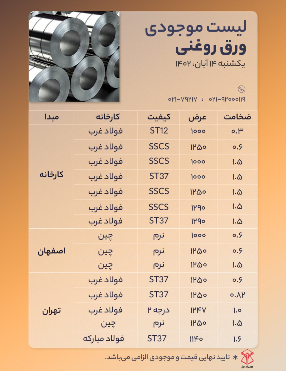 اعلام موجودی ورق روغنی (سرد) همراه فلز