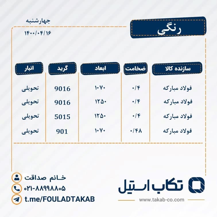 ورق رنگی فولاد تکاب (گروه صنعتی تکاب) محسن اصفهانی "تامین کننده برتر محصولات پایه فولاد در ایران" 📱 ۰۹۱۲۱۲۵۶۱۶۰ ☎️ ۰۲۱۸۸۹۹۸۸۰۵
