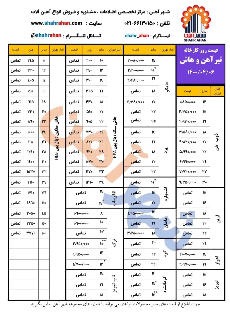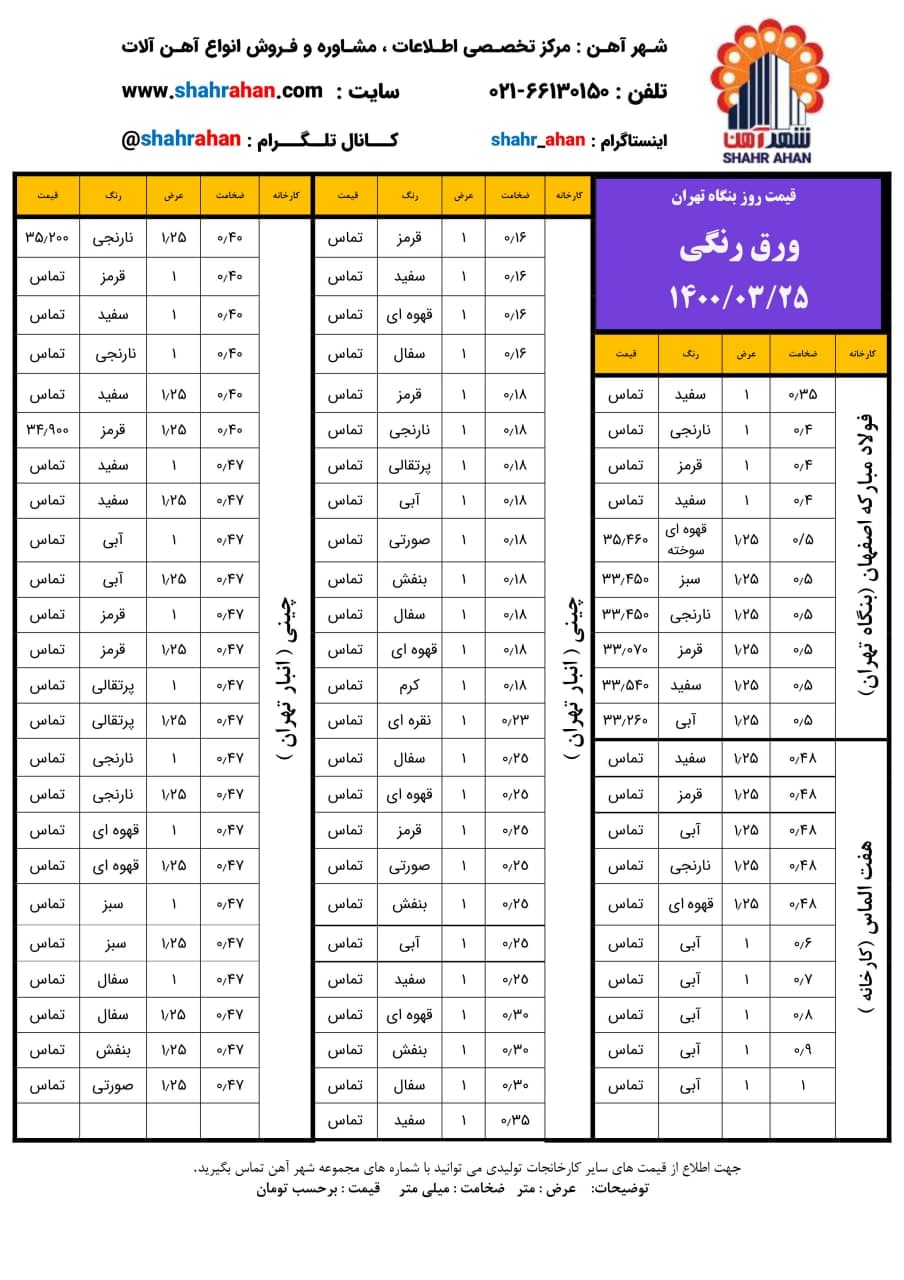 [ Photo ] 🌺🍂🍃🌺🍃🍂🌺🍃🍂 #قیمت_ورق_رنگی در کارخانه 📅 25 خرداد 1400 @shahrahan 🔸مشاهده قیمت به روز کلیه کارخانجات 👇 www.shahrahan.com 🌍آدرس مجموعه شهرآهن https ...