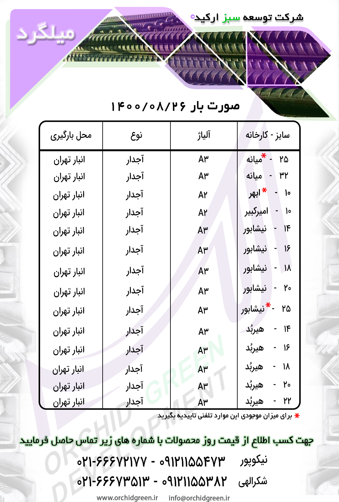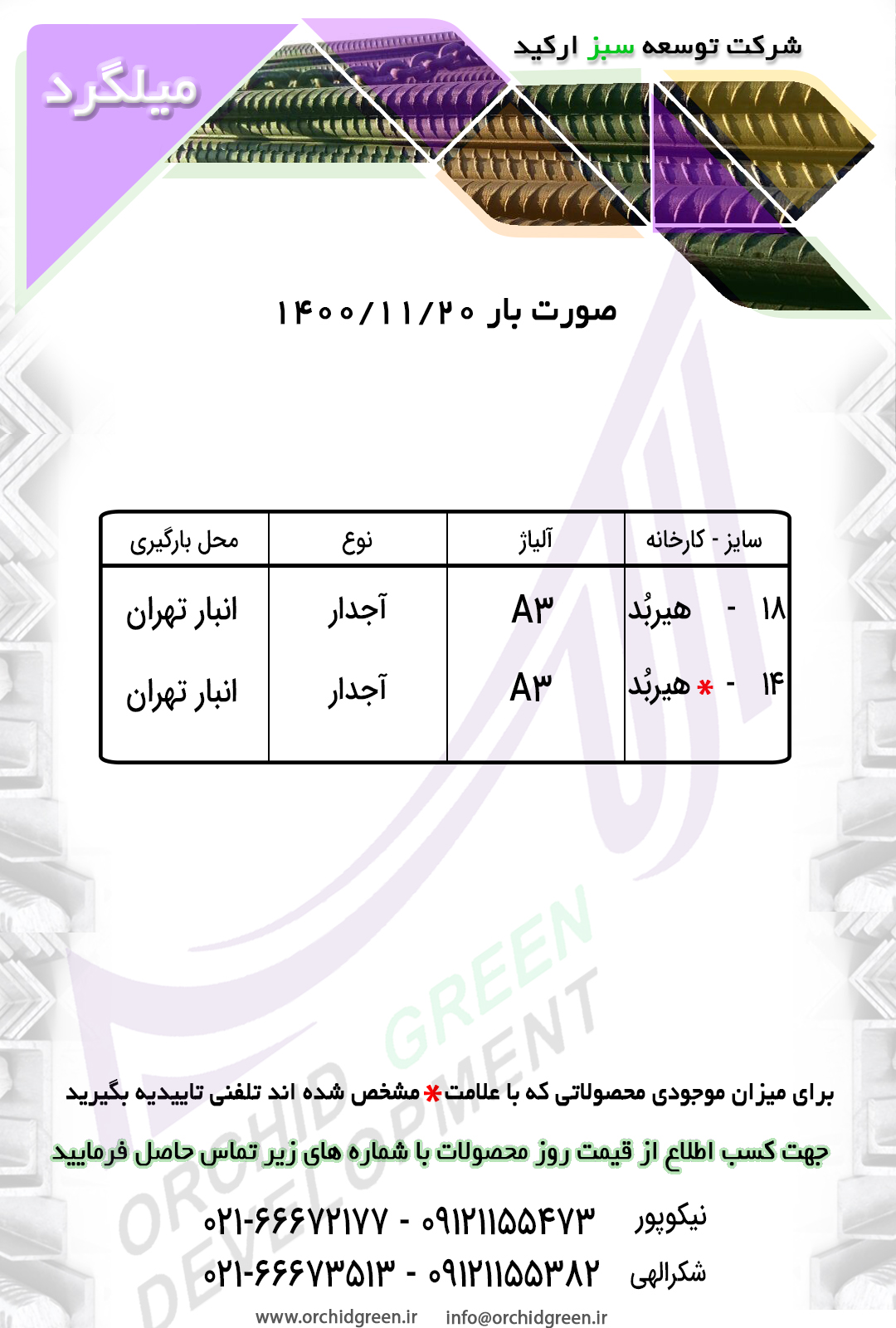برای خرید میلگرد آجدار ، پس از مشاهده صورت بار پیوستی و شماره های تماس آن ، می توانید از فروشگاه آنلاین مخصوص خرید میلگرد ماه نیز بازدید نمایید=> www.orchidg ...
