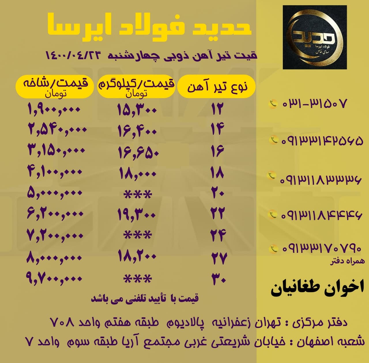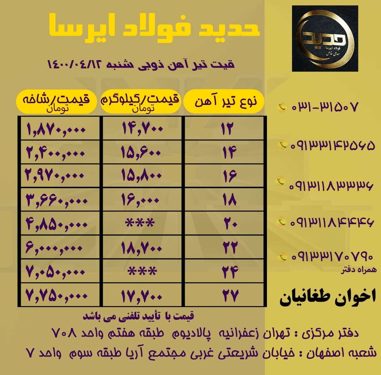 🗓 امروز یکشنبه 17 مرداد ماه ۱۴۰۰. ✅قیمت تیرآهن ذوبی (بنگاه اصفهان) ✅قیمت ها با تایید میباشد.