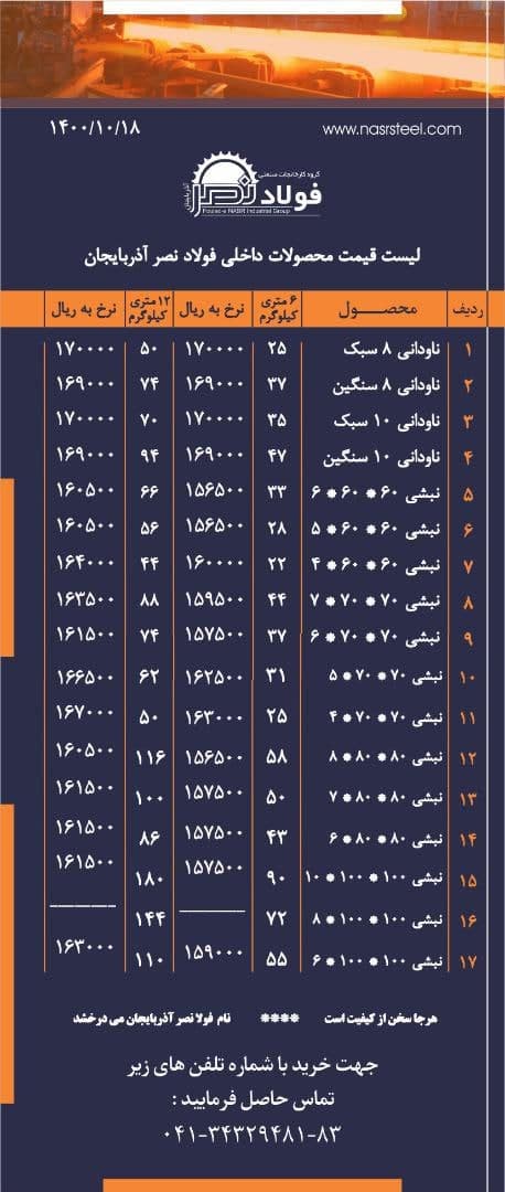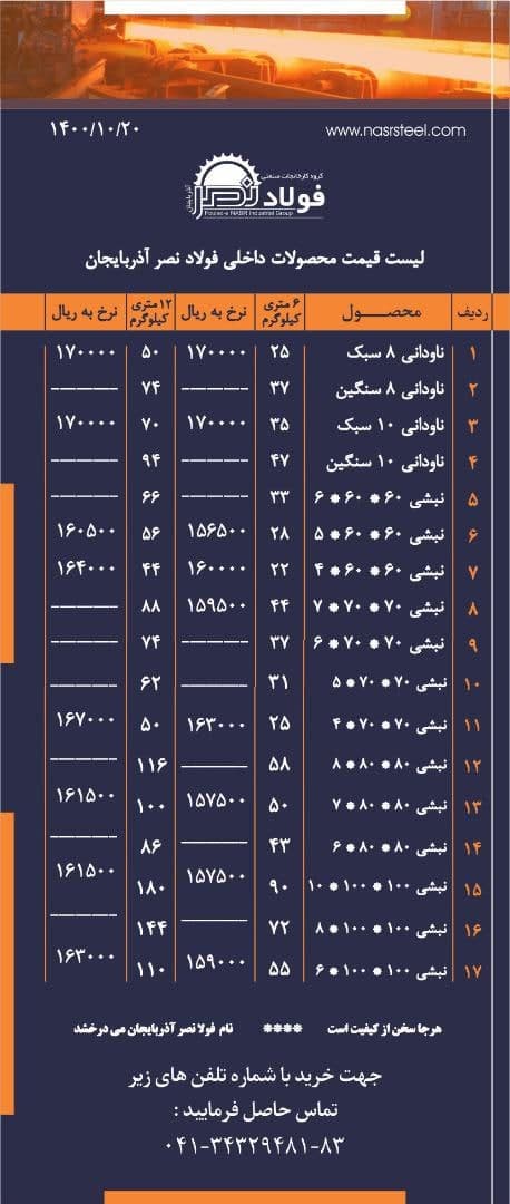 گروه کارخانجات #فولاد_نصر_آذربایجان ⭕️تولید کننده نبشی و ناودانی 👈🏻لیست قیمت محصولات نسبت به آدرس تخلیه شامل تخفیف میباشد. ☎️04134329481 ☎️04134329482 ☎️0413 ...