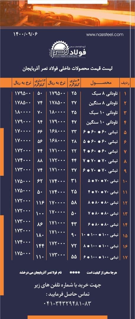✅گروه کارخانجات #فولاد_نصر_آذربایجان ⭕️تولید کننده نبشی و ناودانی فوق سبک 👈🏻لیست قیمت محصولات نسبت به آدرس تخلیه شامل تخفیف میباشد. ☎️04134329481 ☎️0413432948 ...