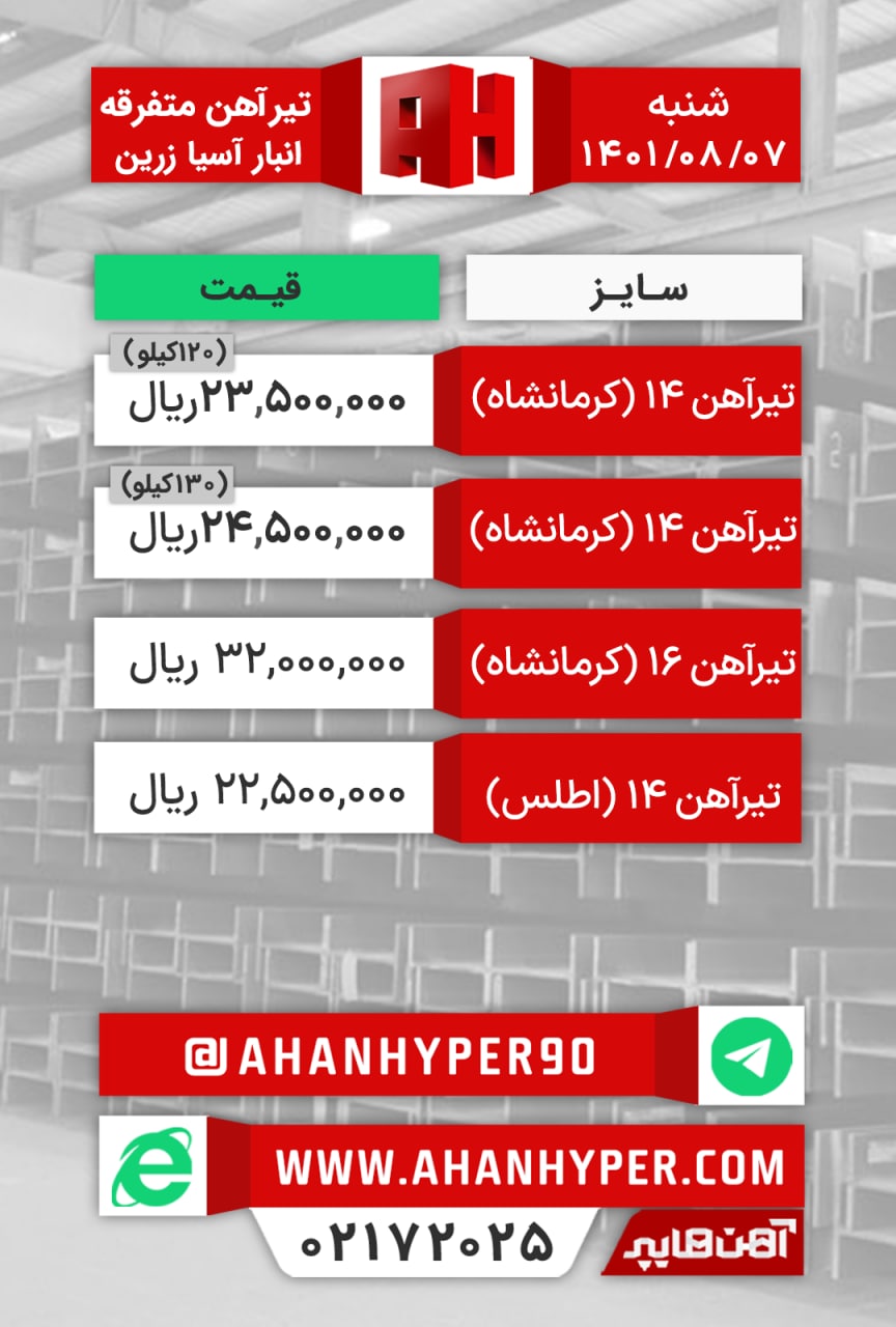 شنبه ۷ آبانماه ۱۴۰۱ #قیمت_تیرآهن ذوب آهن (انبار آسیا زرین) ✅قیمت ها با تایید میباشد.